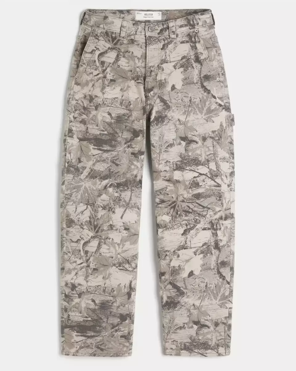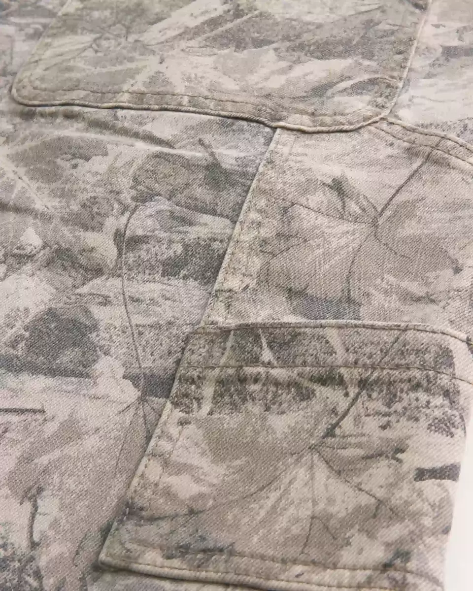 Comfortable painter-style denim skater jeans designed with a baggy leg, left loop detail and extra pockets. All-over camo pattern. Imported.