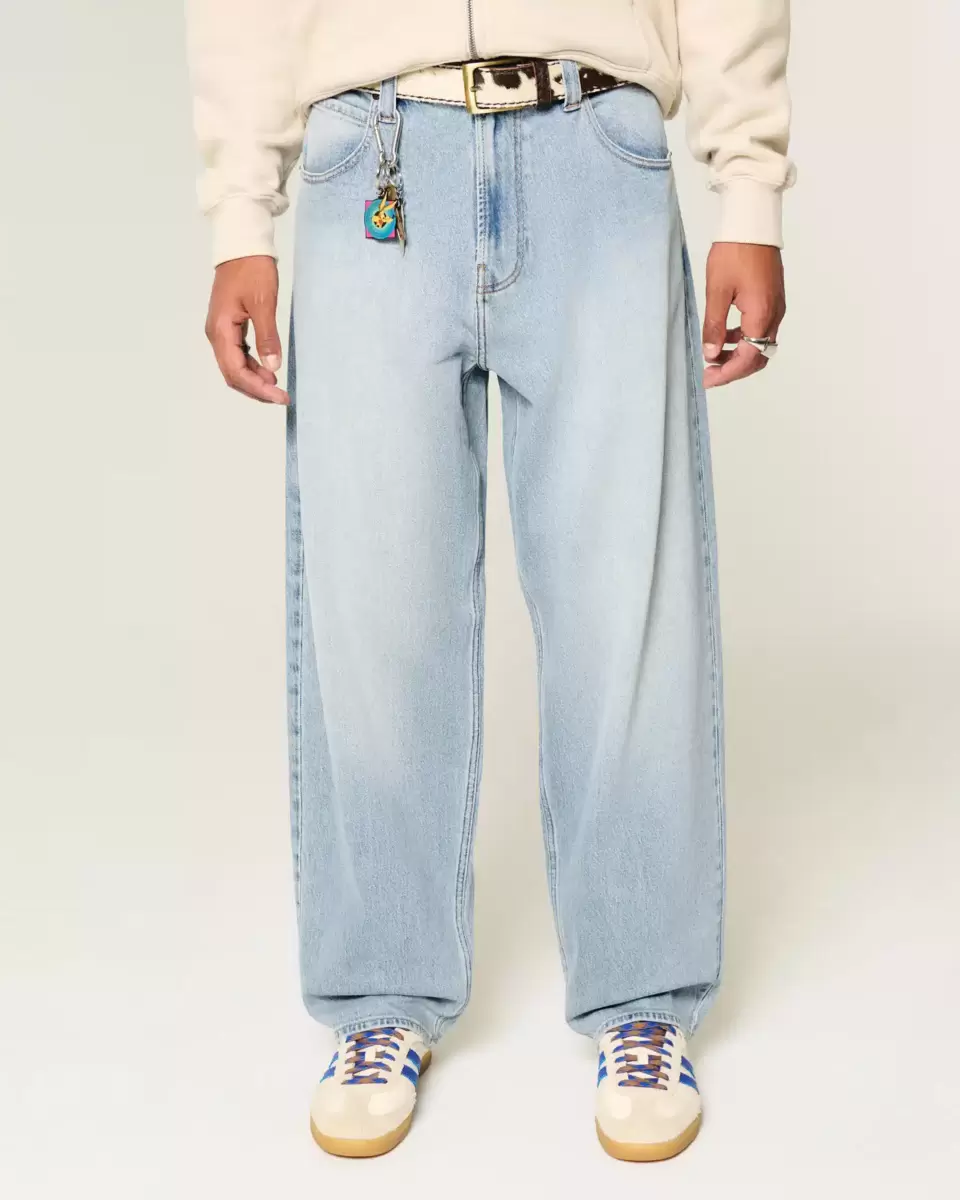 Comfortable denim skater jeans designed with a baggy leg. Light wash with subtle fading, classic 5-pocket styling, embroidered graphic at back pocket. Imported.