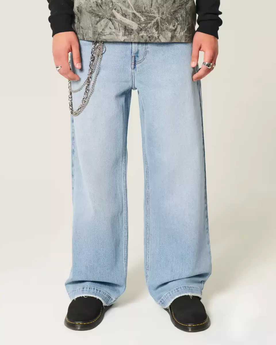 Comfortable denim jeans in a light wash, designed with a super baggy leg. Fading, astronaut graphic embroidery at left pocket.