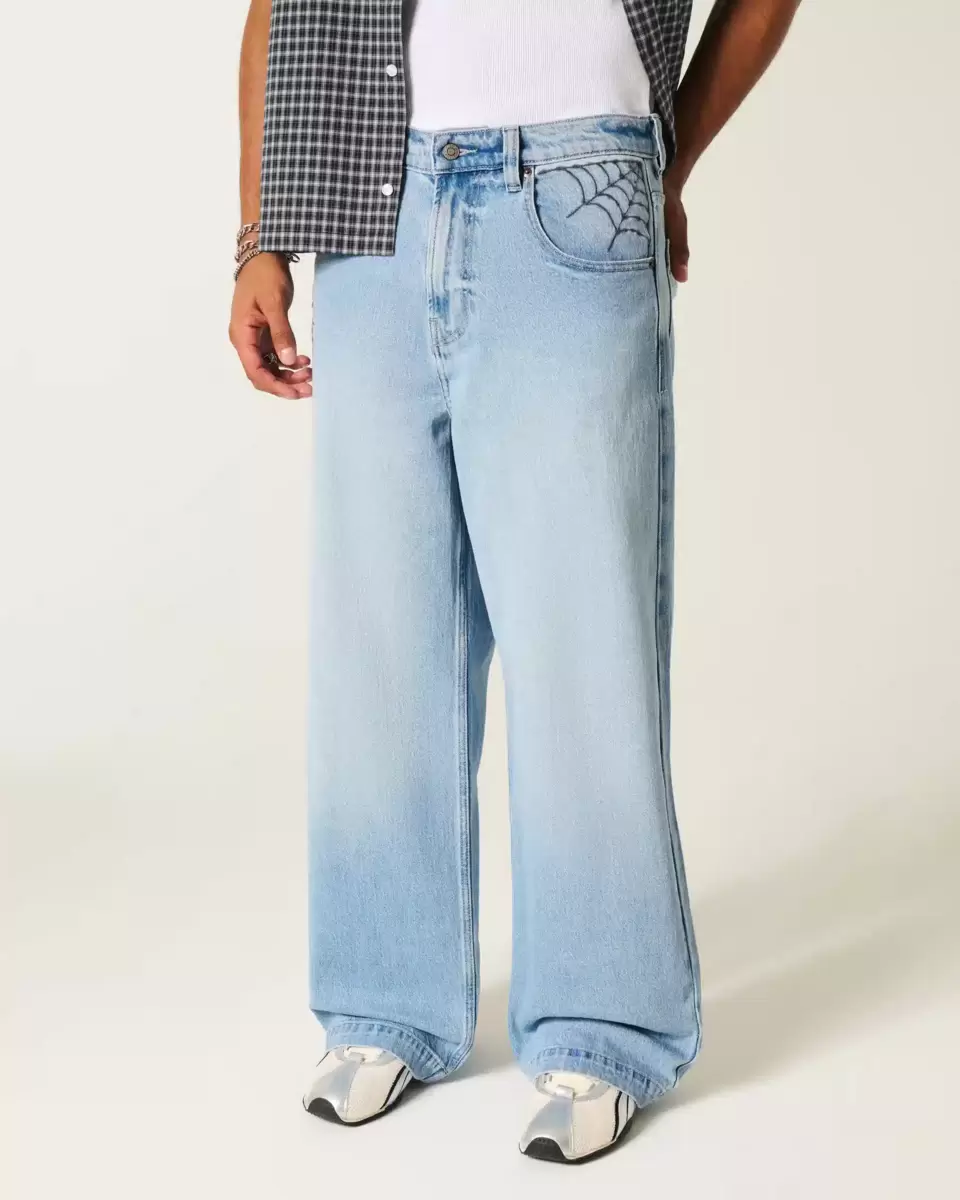 Comfortable denim jeans in a light wash, designed with a super baggy leg. Iconic 5-pocket styling, spider and web graphic embroidery, fading. Imported.