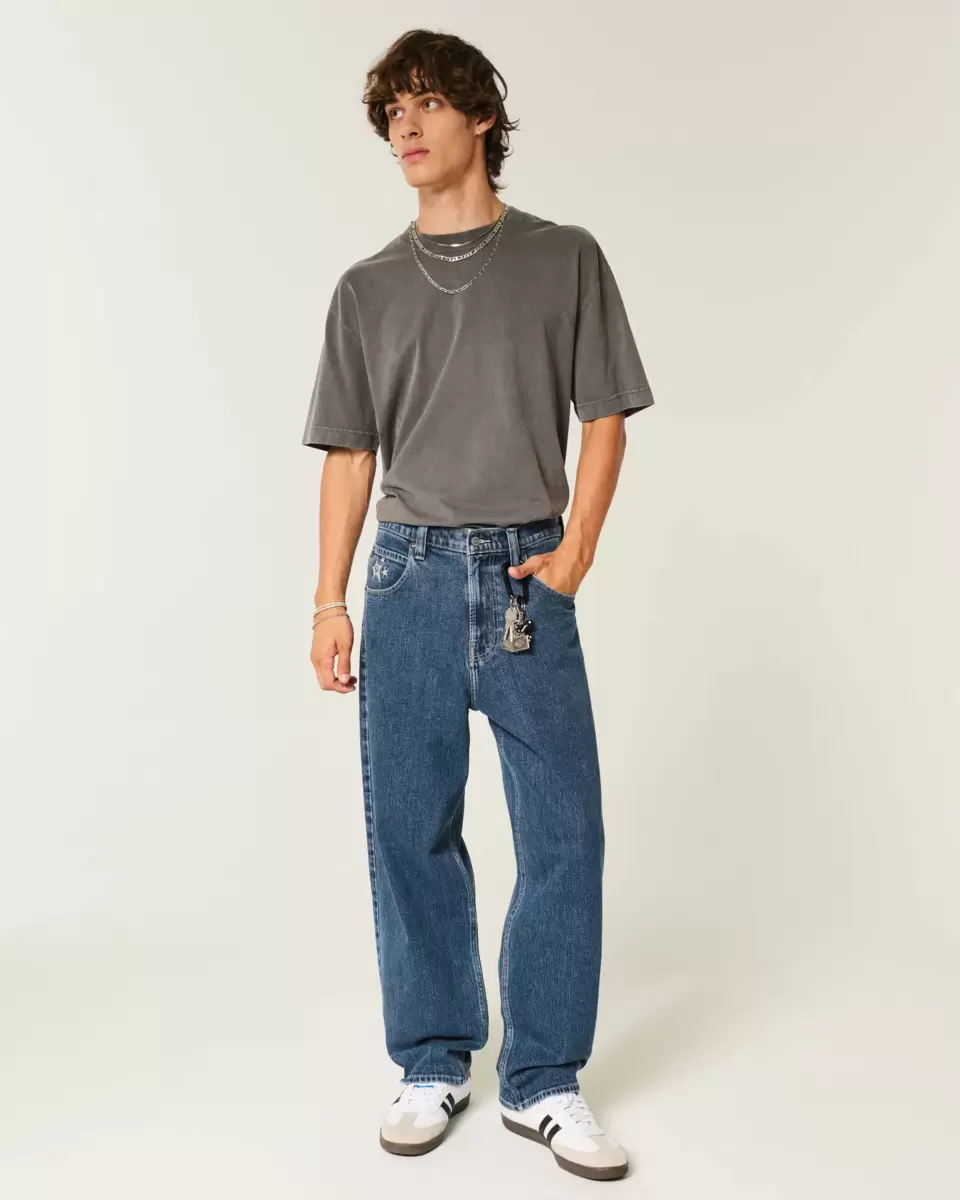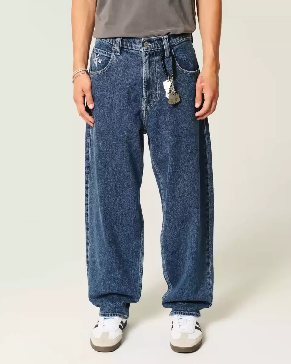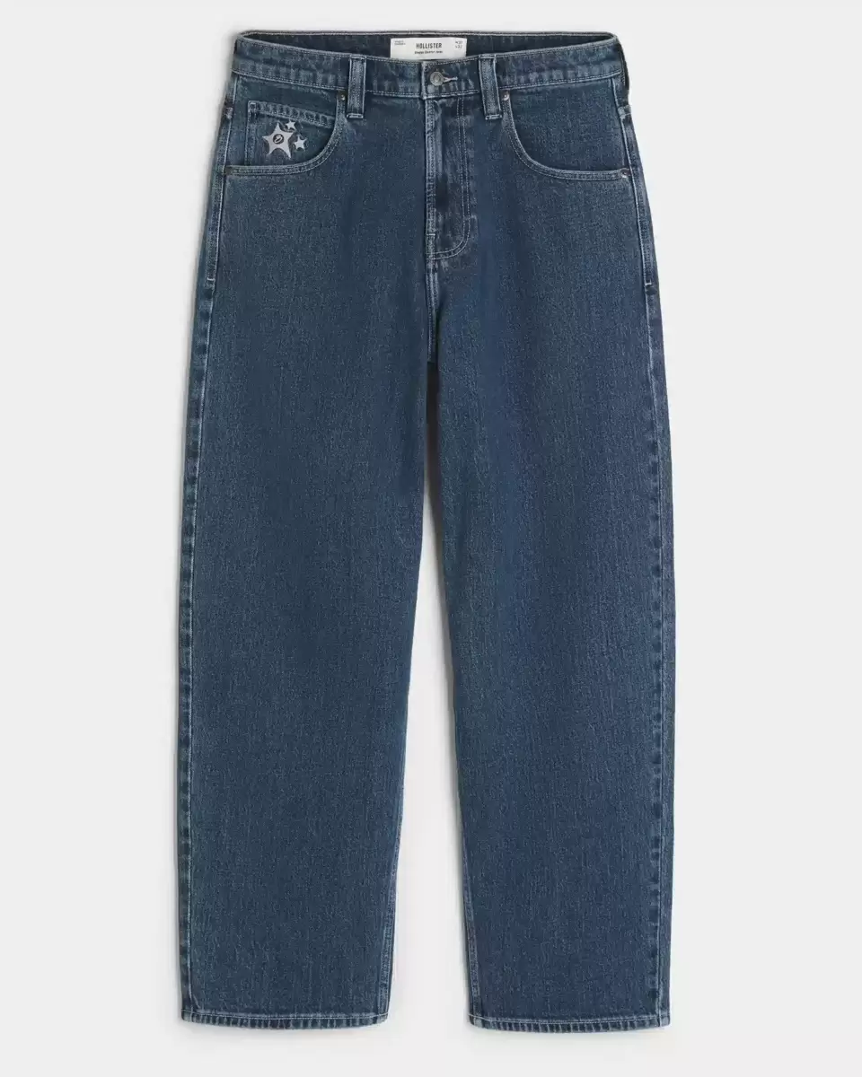 Comfortable denim skater jeans designed with a baggy leg. Medium wash, classic 5-pocket styling, embroidered star graphic at right coin pocket.