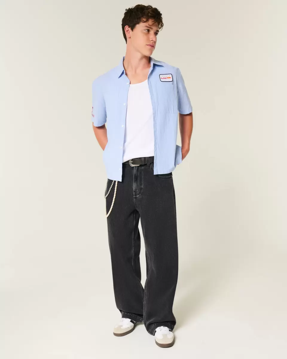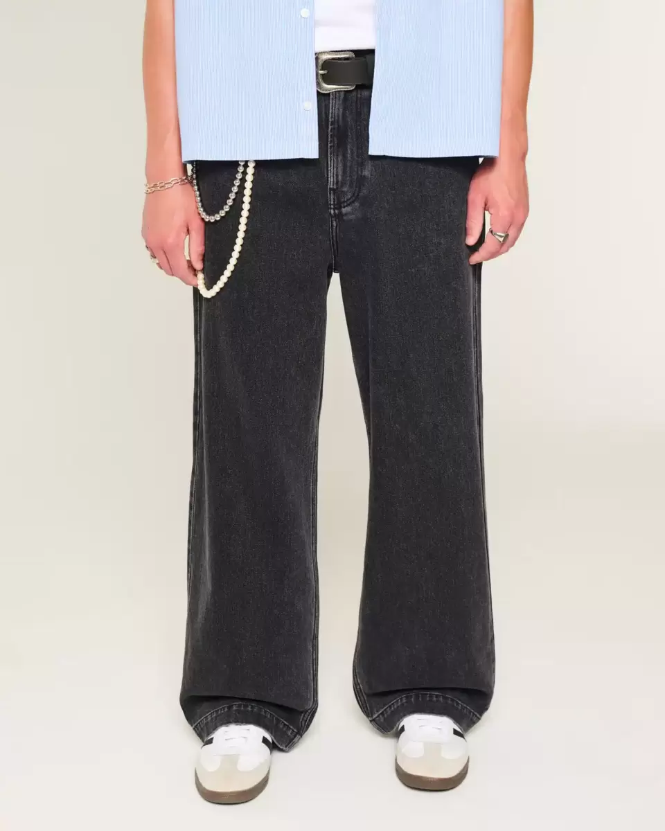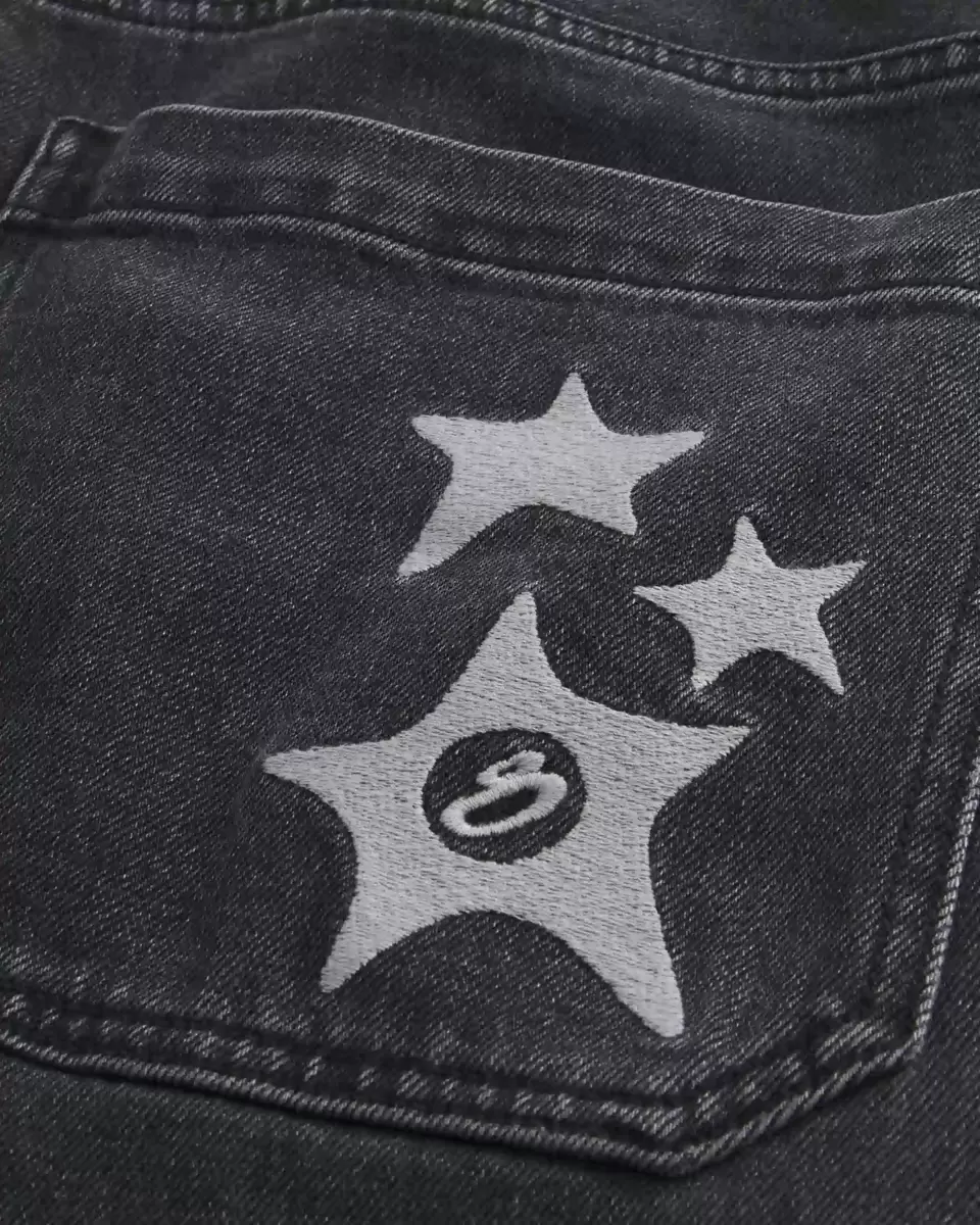 Comfortable denim jeans in washed black, designed with a super baggy leg. Embroidered star graphic at back pocket.