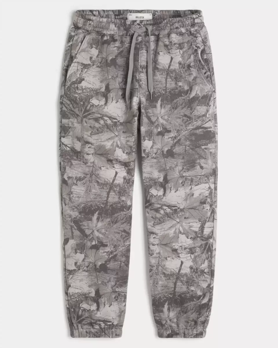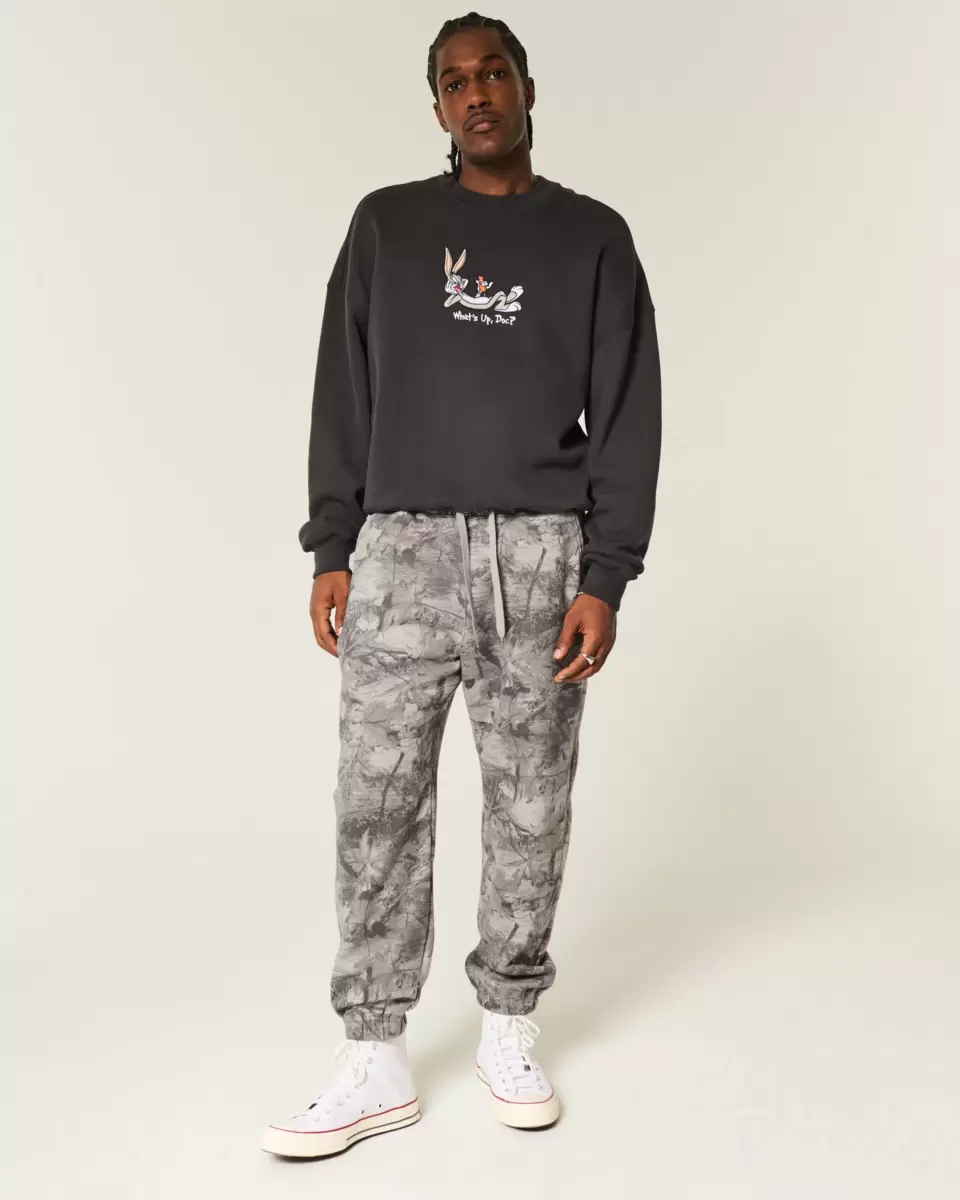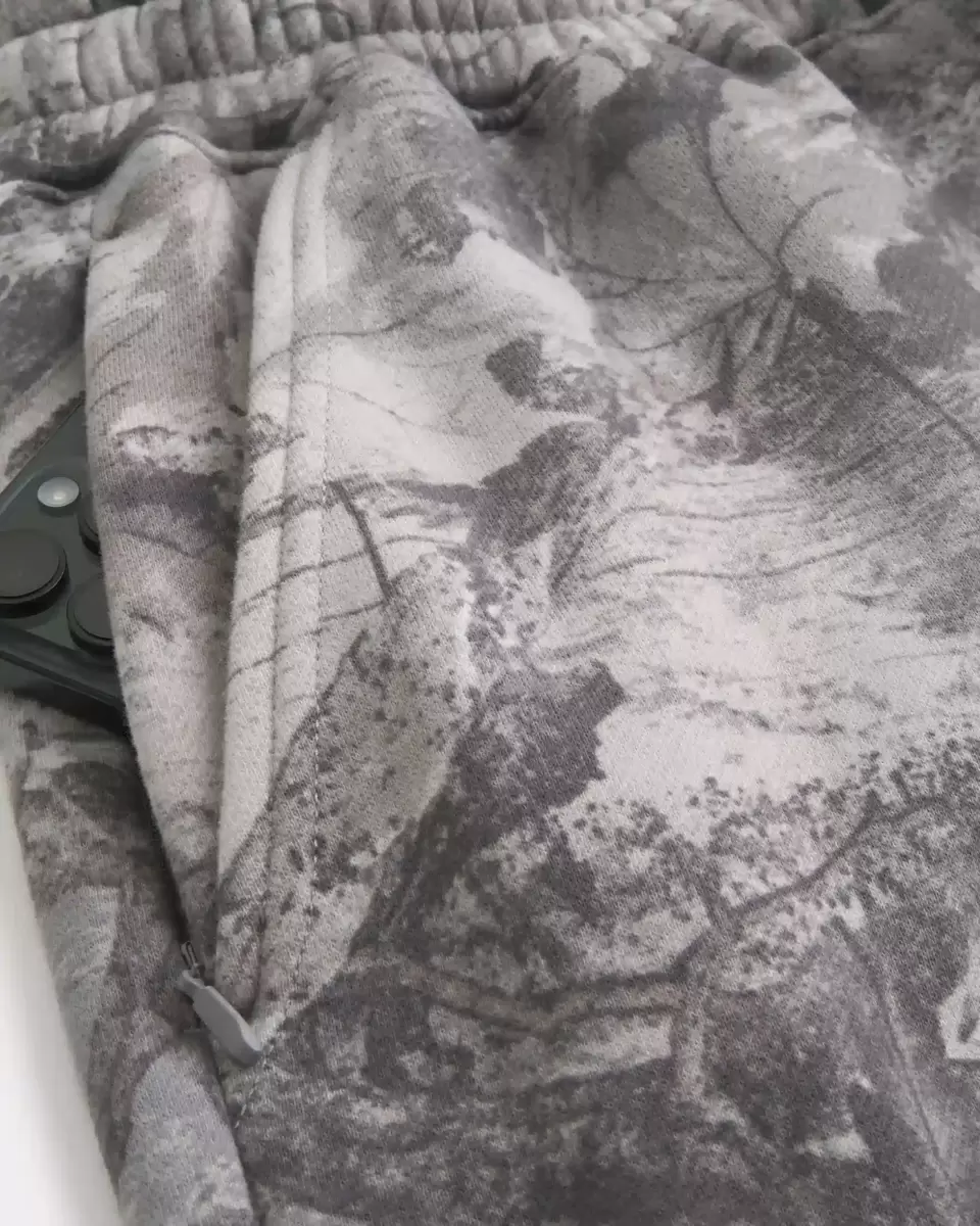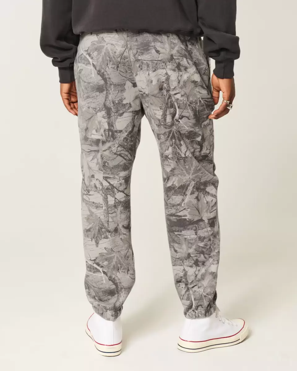 Super soft fleece joggers designed with a baggy leg and cinched hem. All-over camo pattern, pockets, right zipper pocket, drawstring waist. Imported.