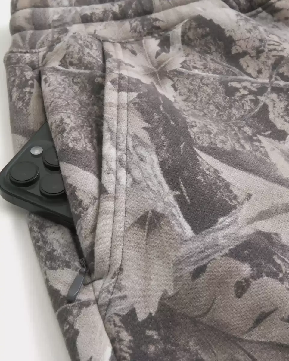 Super soft fleece sweatpants designed with a bootcut leg. Pockets, right zipper pocket, drawstring waist, all-over camo pattern. Imported.