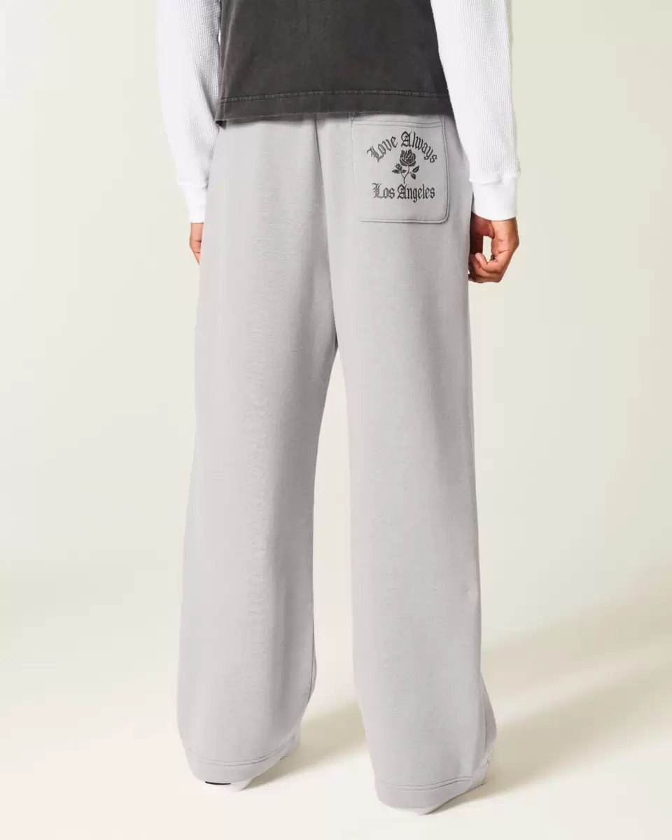 Comfortable fleece sweatpants designed with a super baggy leg and drawstring waist. Love Always Los Angeles print graphics at back pocket, front pockets, right zipper pocket. Imported.