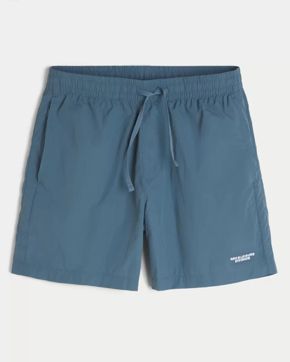 Ultra-comfortable track shorts in 100% nylon, designed with a drawstring waist and right zipper pocket. Embroidered Rec & Leisure Division detail at left leg. Hits above the knee. Imported.