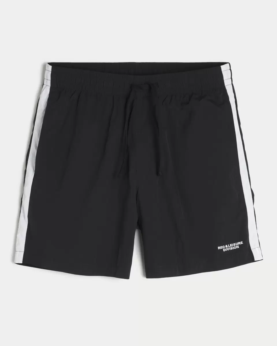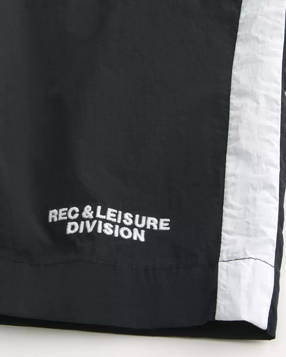 Ultra-comfortable track shorts in 100% nylon, designed with a drawstring waist and right zipper pocket. Embroidered Rec & Leisure Division detail at left leg. Hits above the knee. Imported.
