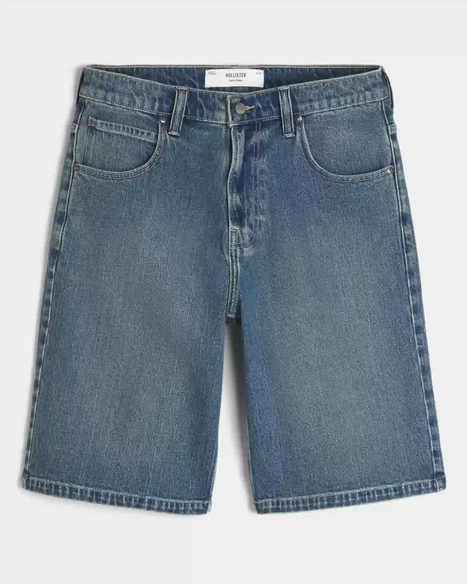 Comfortable denim shorts designed with a super baggy leg and below-the-knee length. Dark wash with fading. Imported.