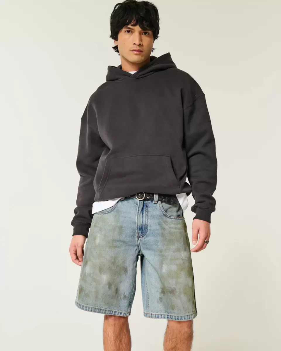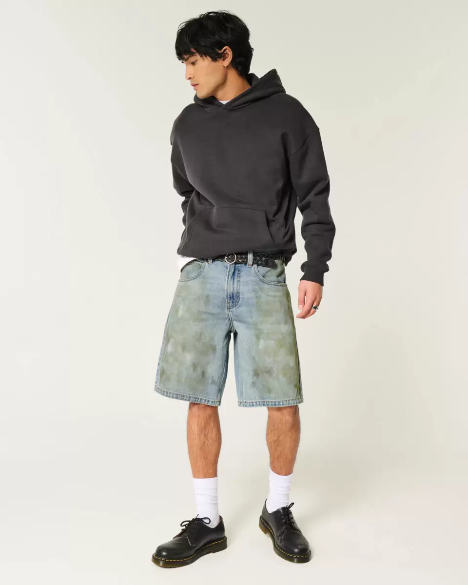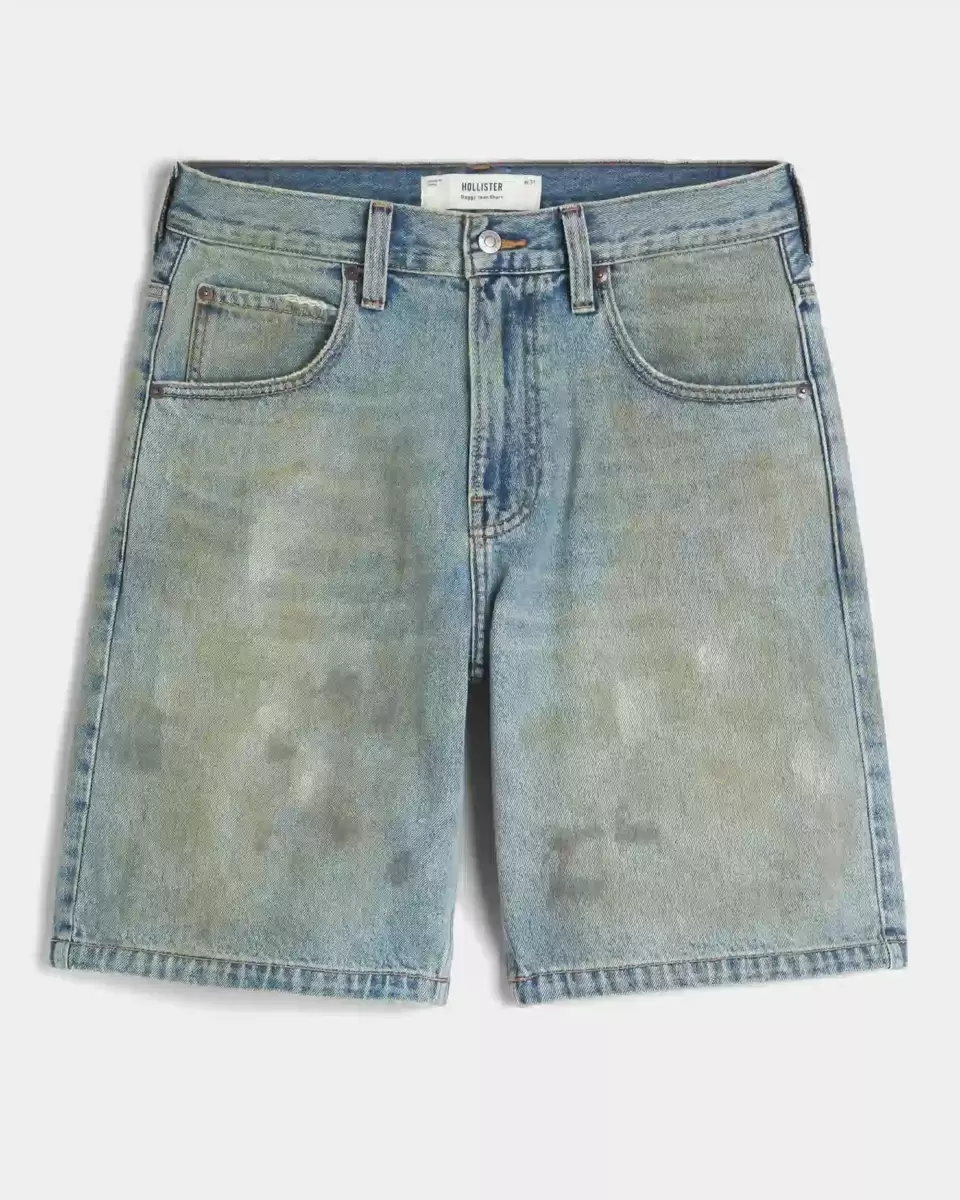 Comfortable denim jean shorts designed with a baggy leg. Fading, whiskering, all-over grease detailing.