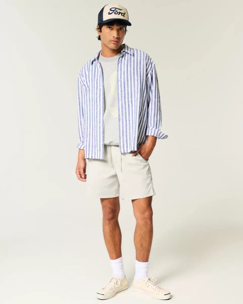 Comfortable twill shorts that hit mid thigh, designed with a pull-on drawstring waist. Pockets, right zipper pocket. Imported.