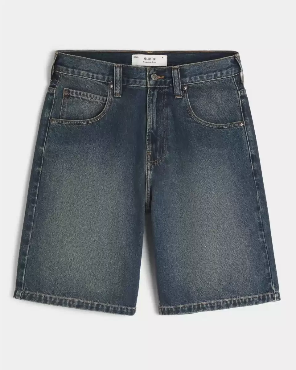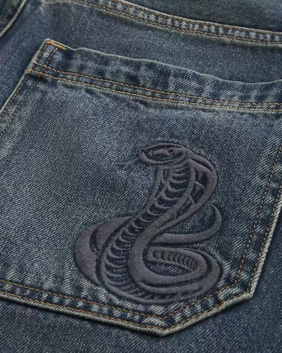 Comfortable denim shorts designed with a baggy leg, featuring an embroidered snake graphic at the back pocket. Fading.