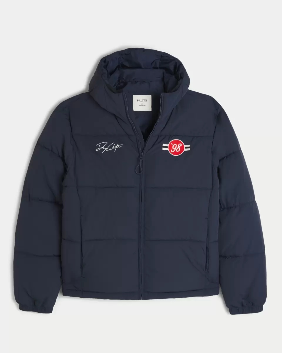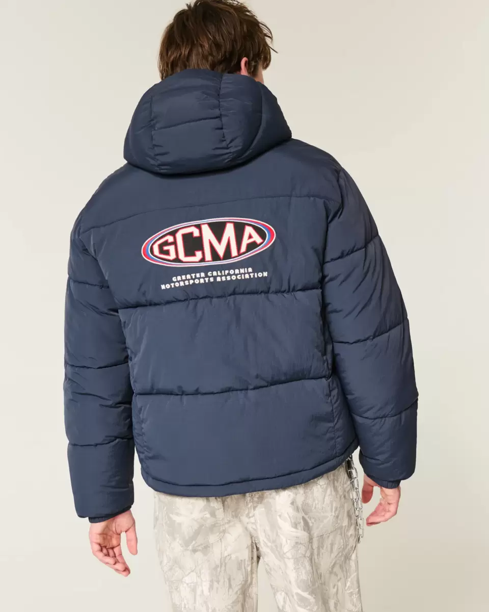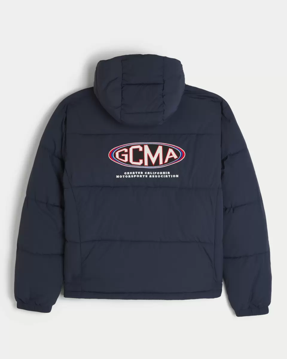 This mid-weight auto-inspired puffer jacket features Greater California Motorsports Association graphic embroidery and applique at the front and back. Quilted channeling, zip-up closure, pockets, hood. Imported.