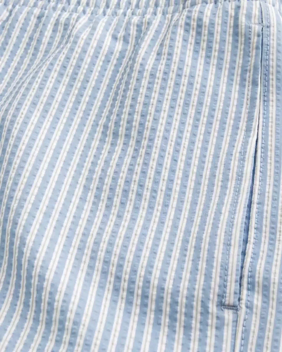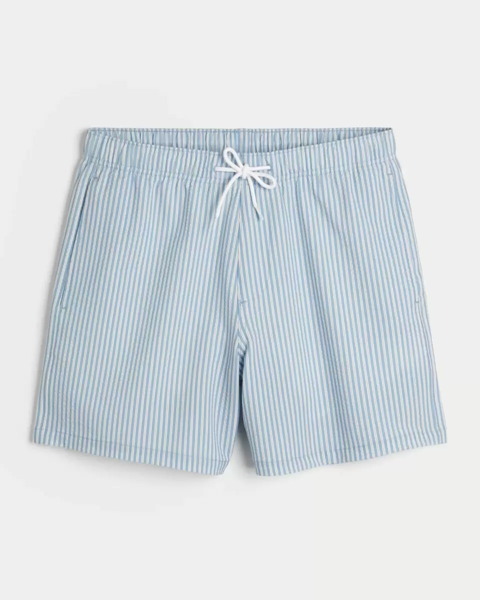 Shorter-length swim trunks that hit mid-thigh. Featuring comfortable 4-way stretch seersucker swim fabric and a 6″ inseam. Front pockets, mesh lining. Imported.