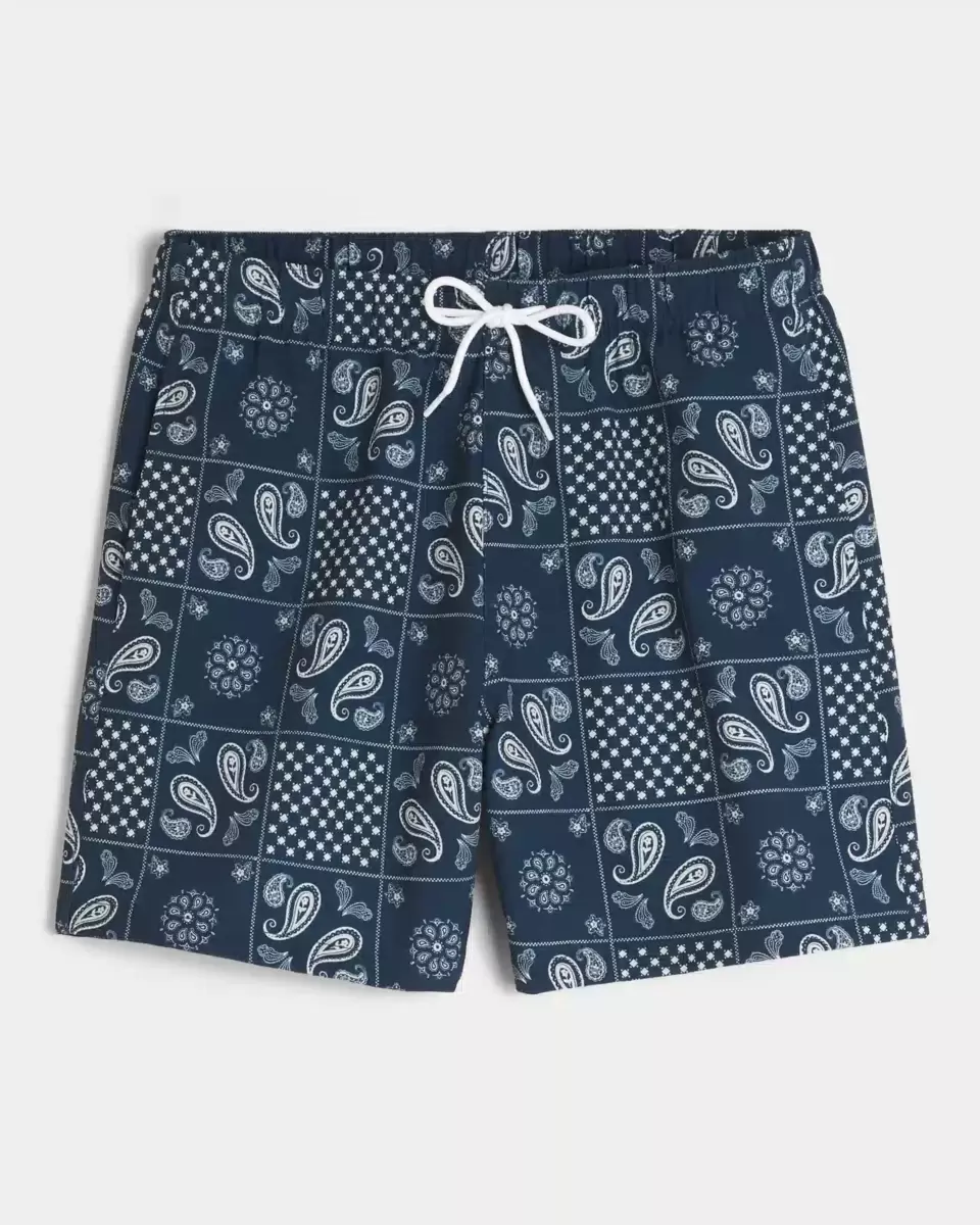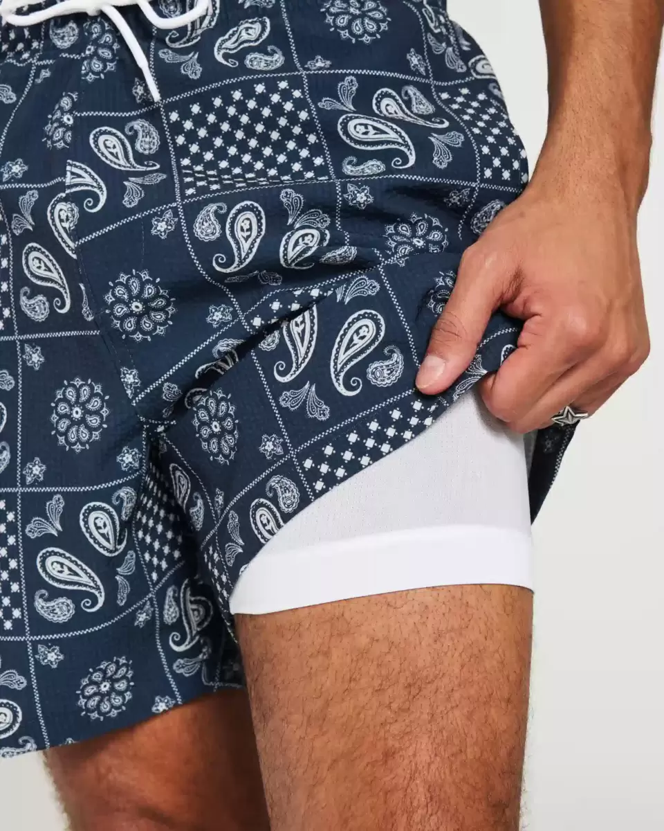 Shorter-length swim trunks that hit mid-thigh. Featuring comfortable 4-way stretch seersucker swim fabric and a 6″ inseam. Front pockets, mesh lining. Imported.