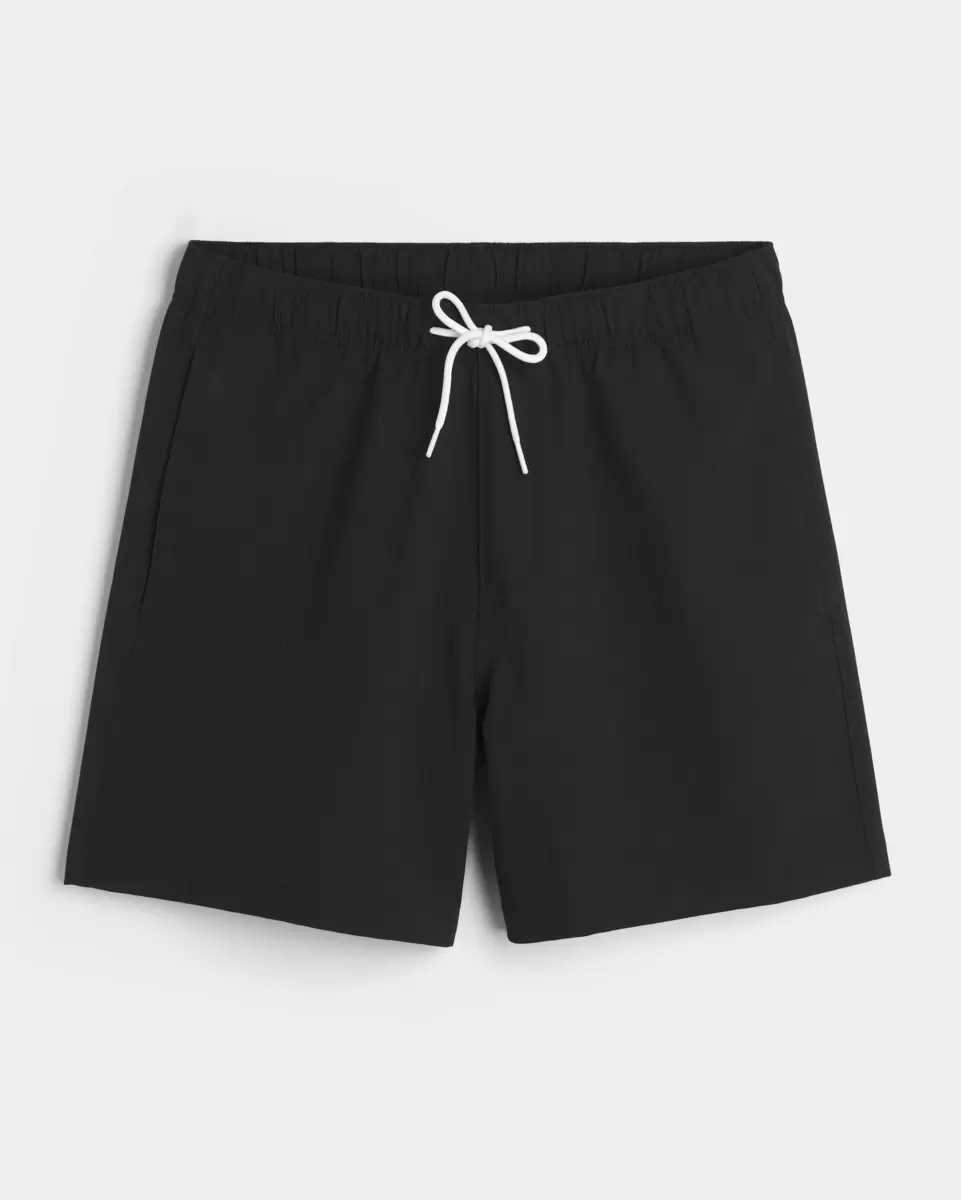 Shorter-length swim trunks that hit mid-thigh. Featuring comfortable 4-way stretch seersucker swim fabric and a 6″ inseam. Front pockets, mesh lining. Imported.