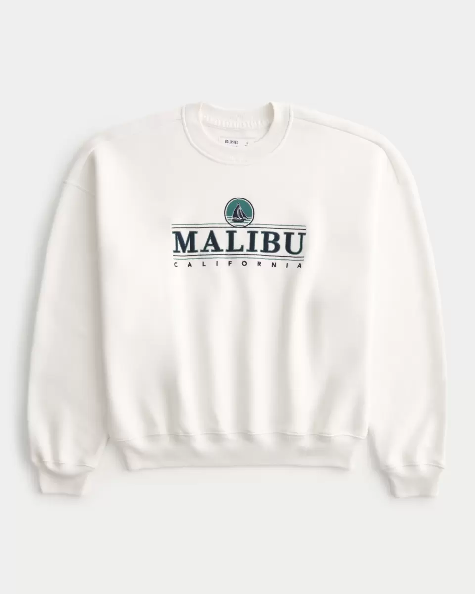 This super soft fleece sweatshirt features Malibu California graphic embroidery and applique. Crew neckline, long sleeves. Baggy Cinch Fit. Imported.