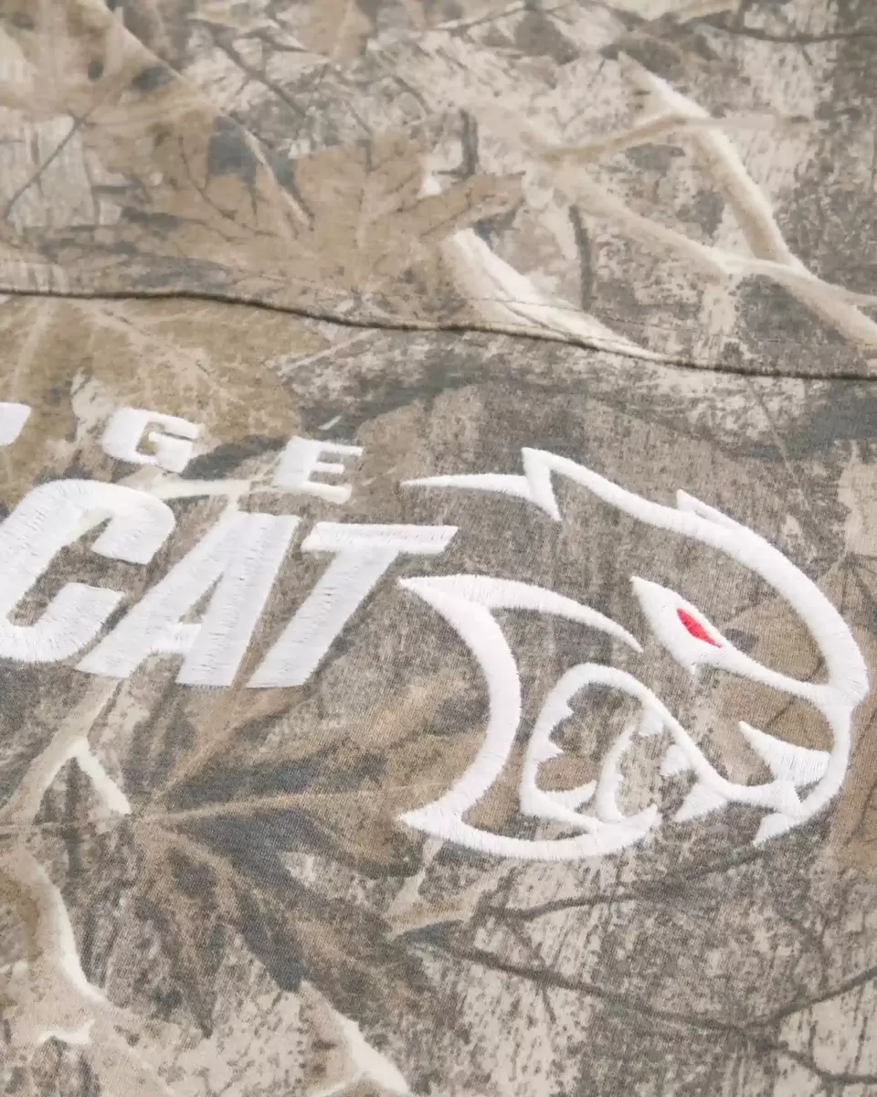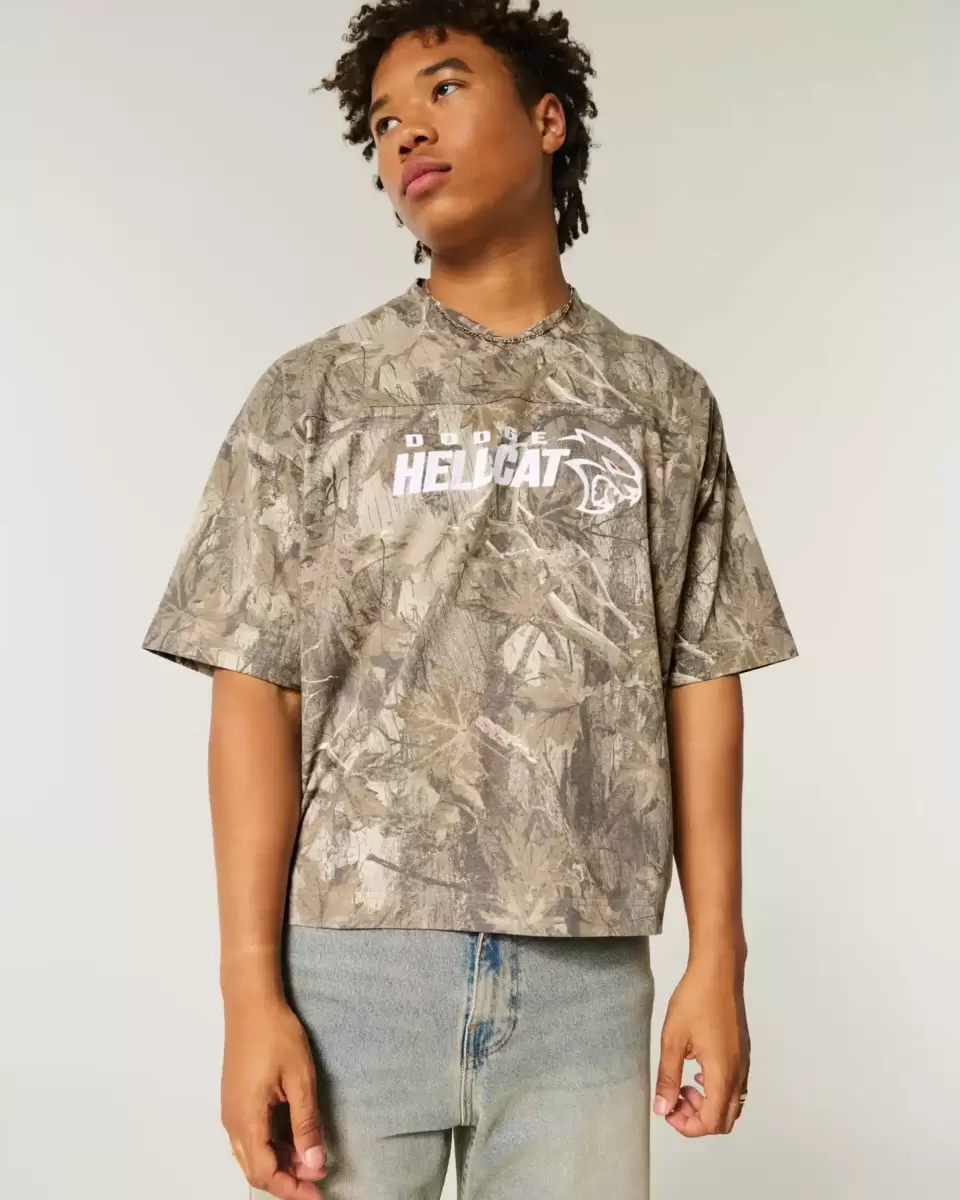 A super soft football tee in heavyweight cotton, featuring official licensed Dodge Hellcat graphic embroidery and an all-over camo pattern. V-neckline, short sleeves. Baggy Crop Fit. Imported.