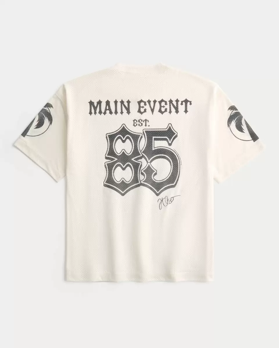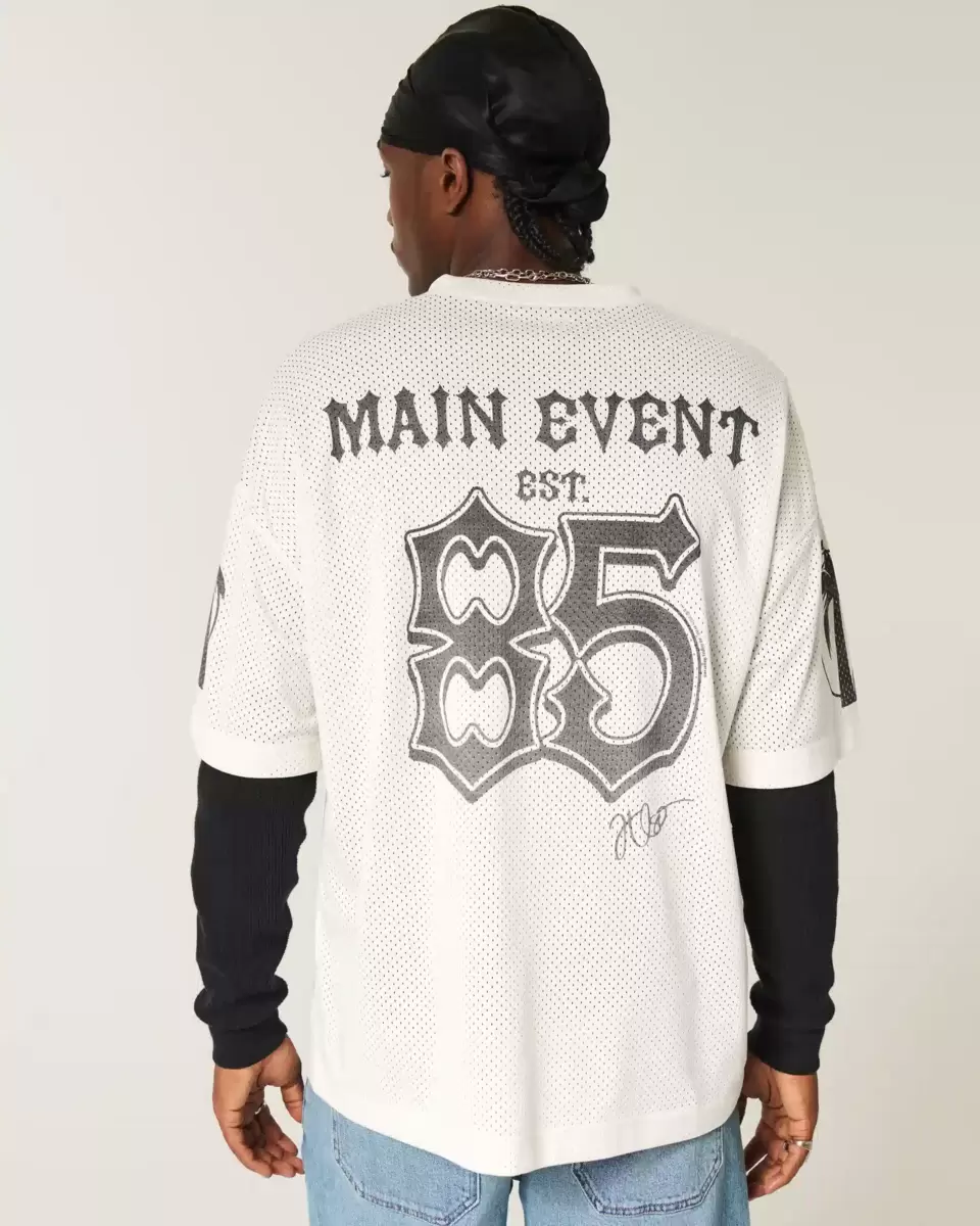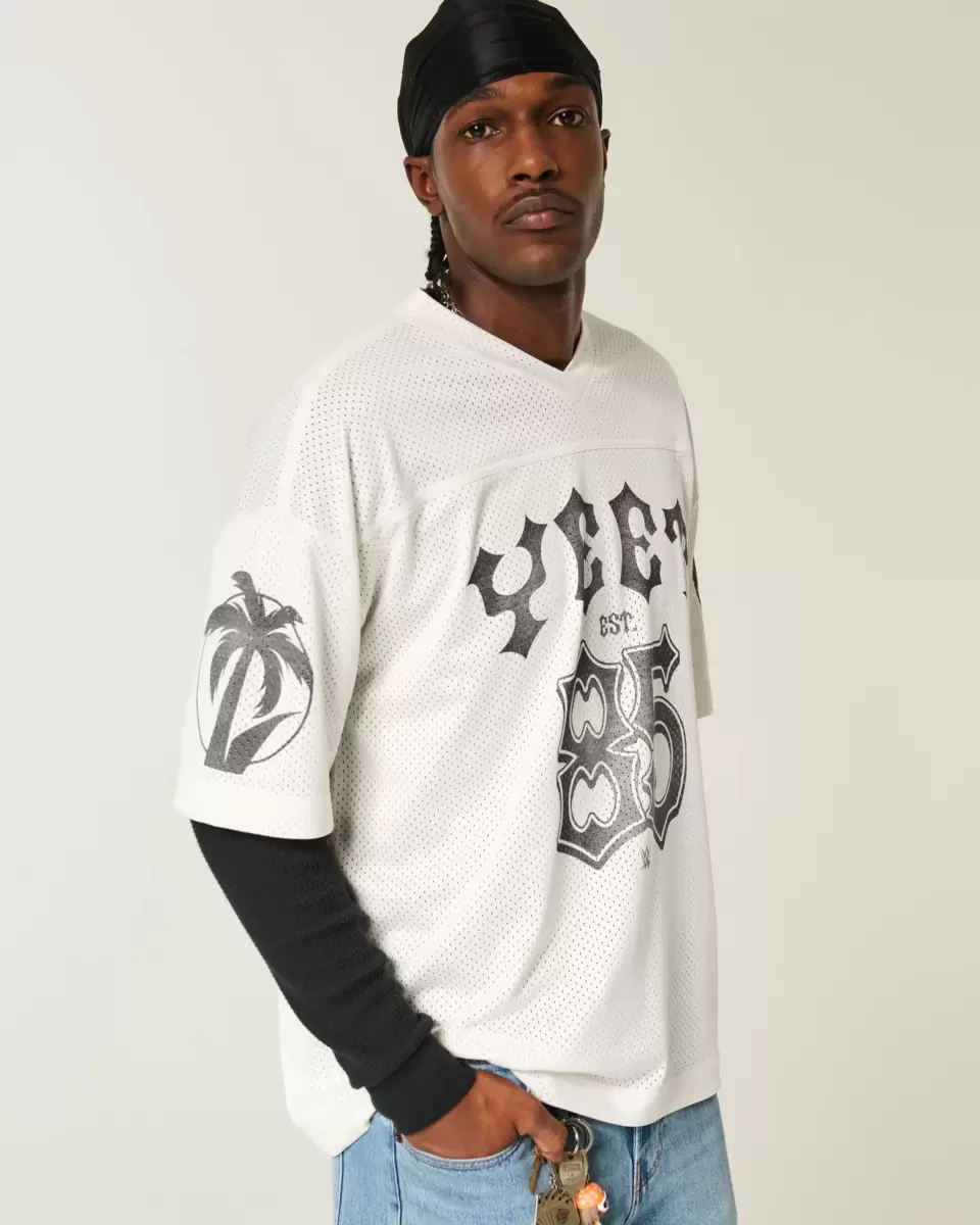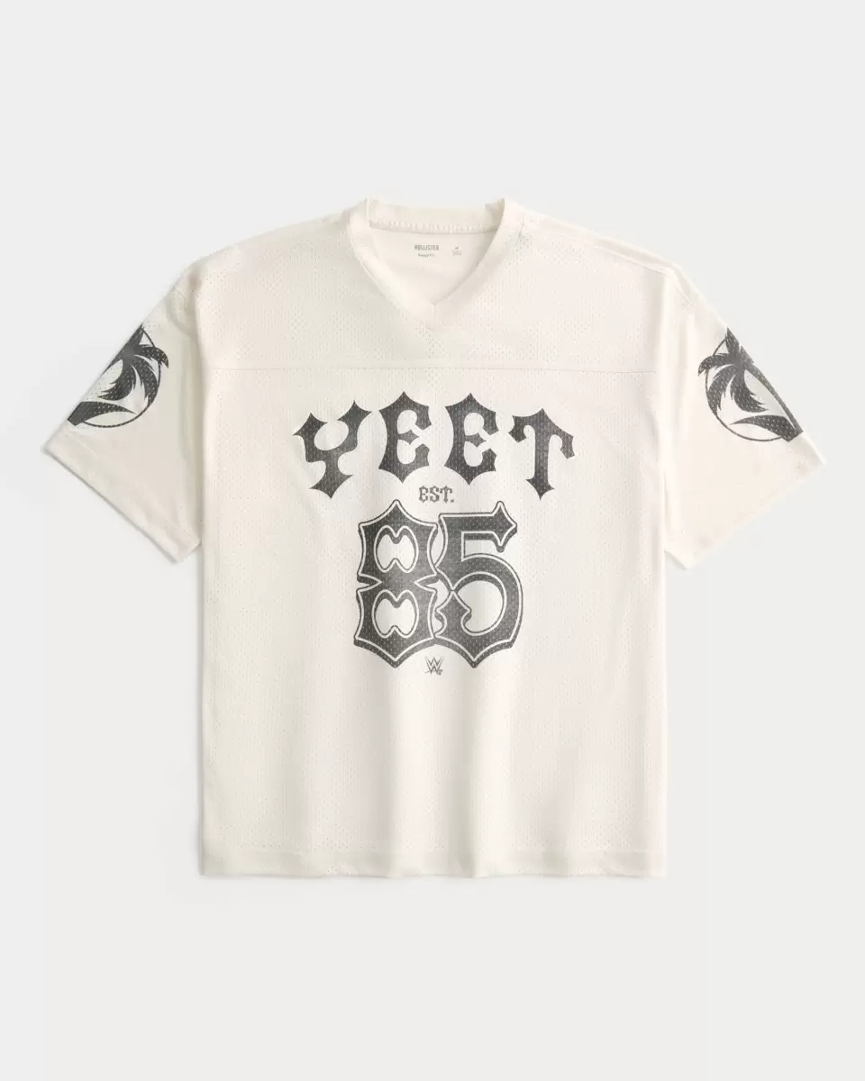 A soft football jersey in mesh fabric featuring official licensed Jey Uso YEET WWE print graphics at the front, back and sleeves. V-neckline, short sleeves. Baggy Fit. Imported.