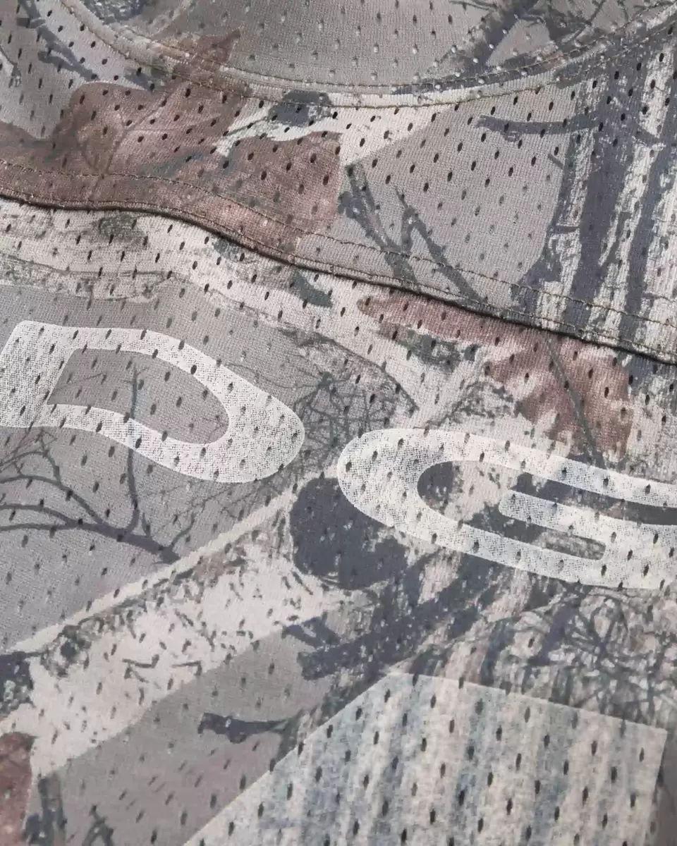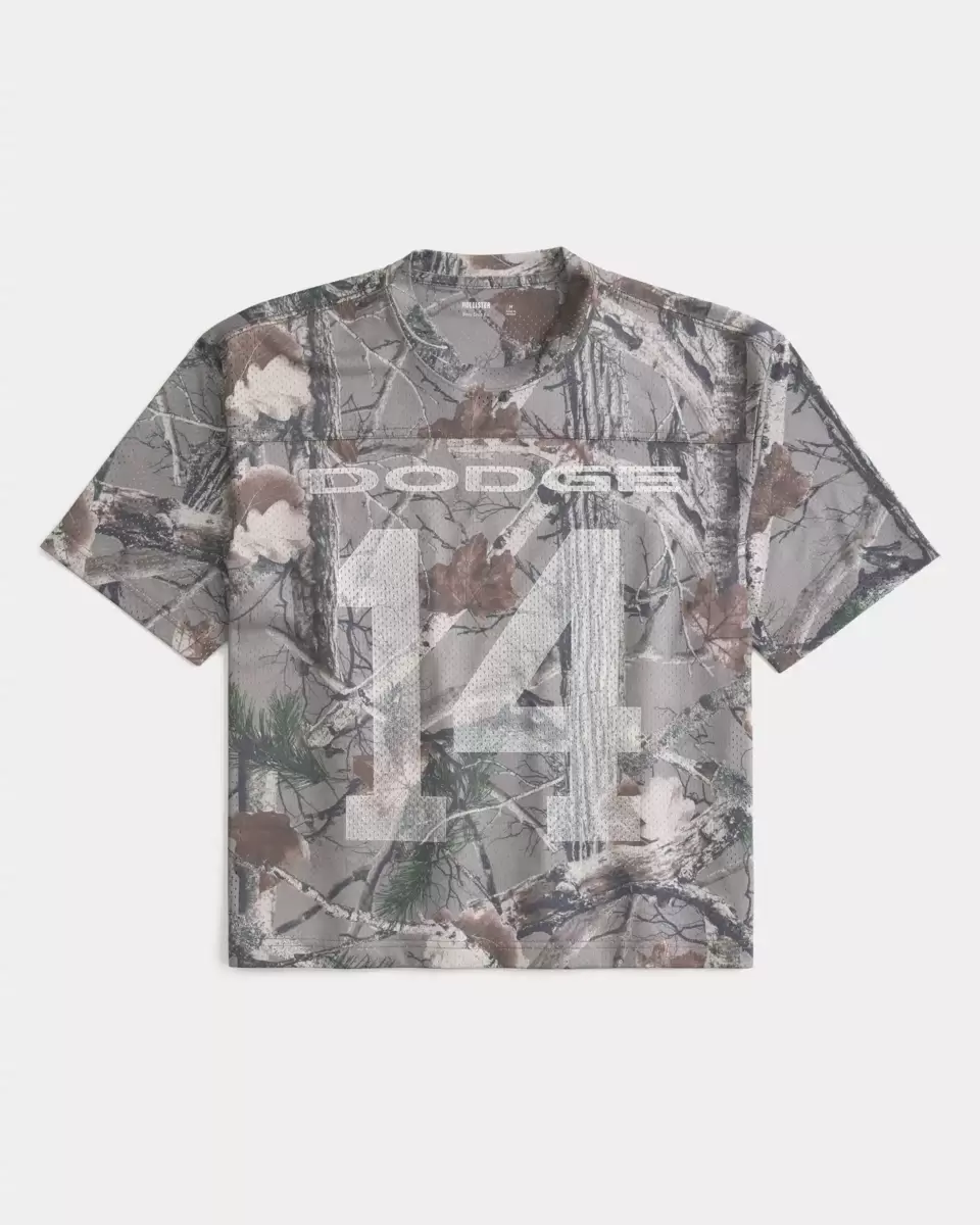 This mesh jersey features official licensed Dodge Hellcat and number print graphics at the front and back. Crew neckline, short sleeves, all-over camo pattern. Boxy Crop Fit. Imported.