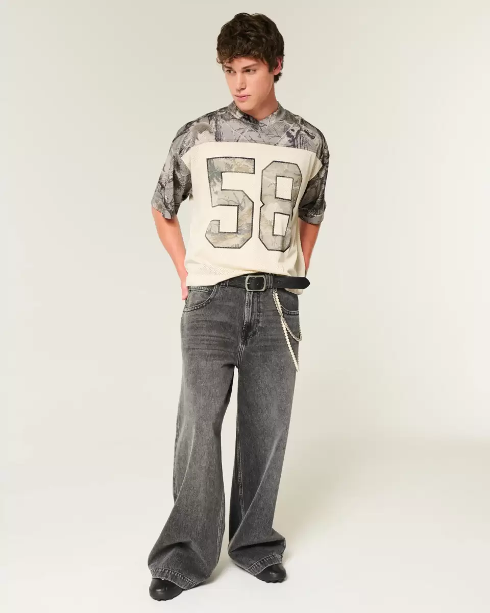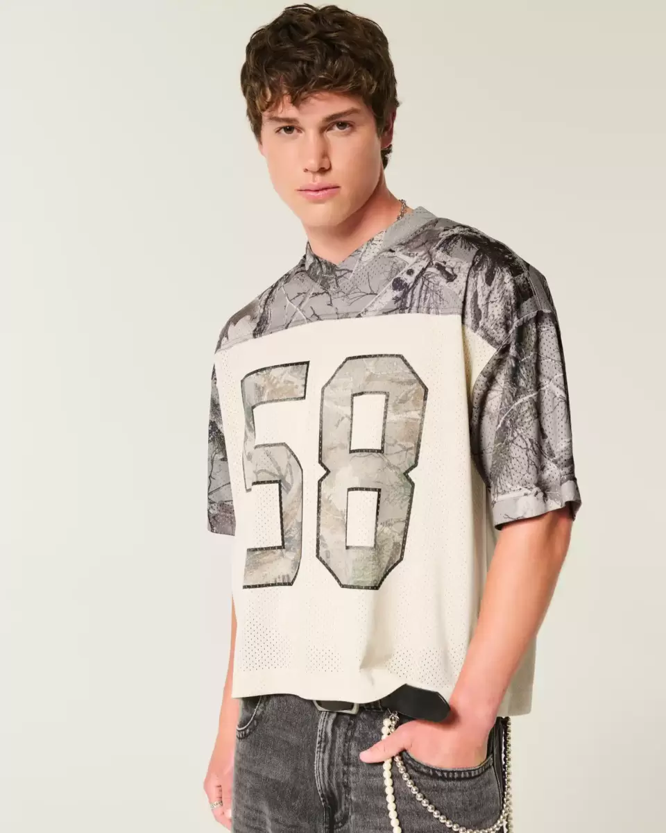 A classic football jersey in soft mesh fabric, featuring a camo pattern and number graphic. Short sleeves, v-neckline. Boxy Crop Fit. Imported.