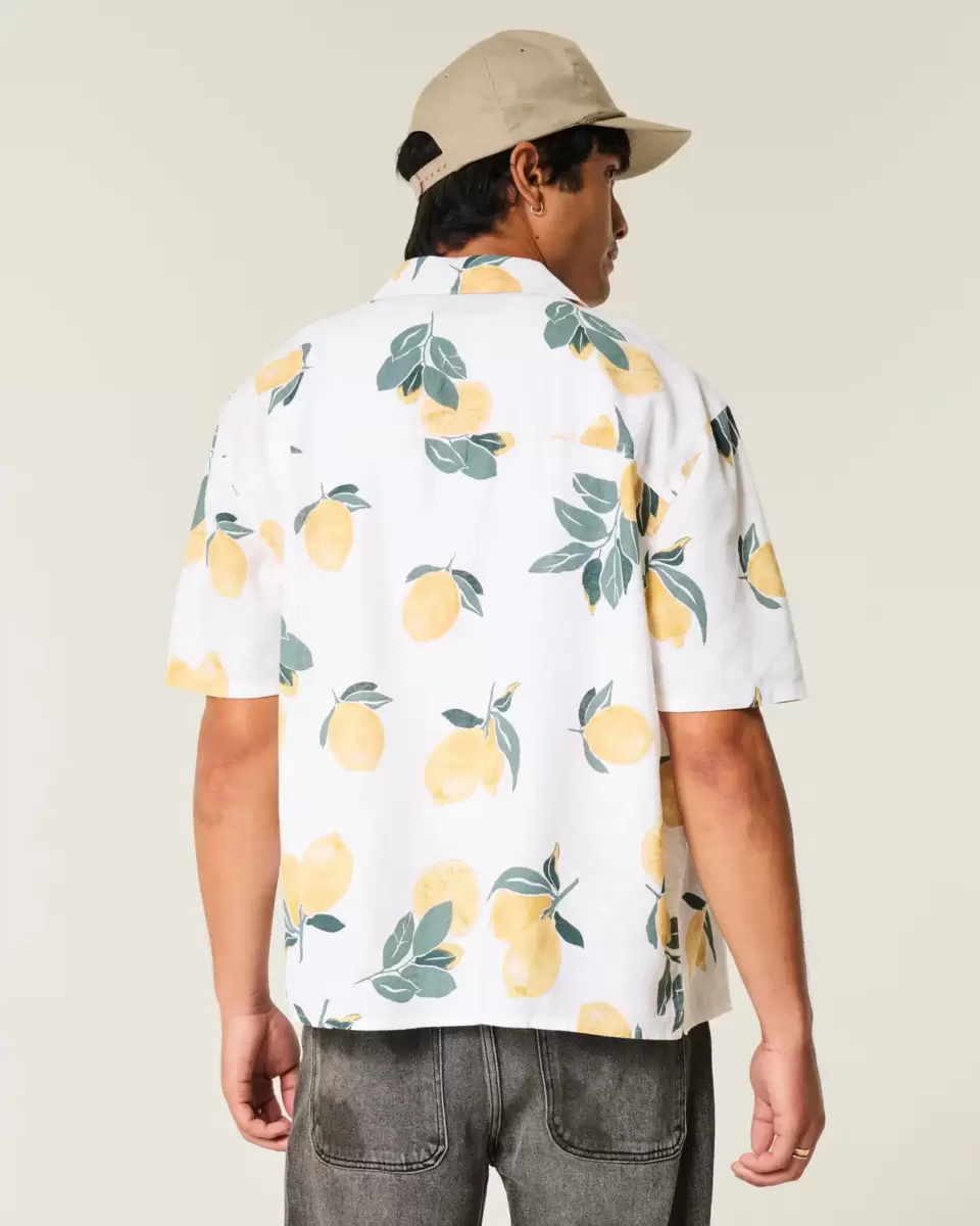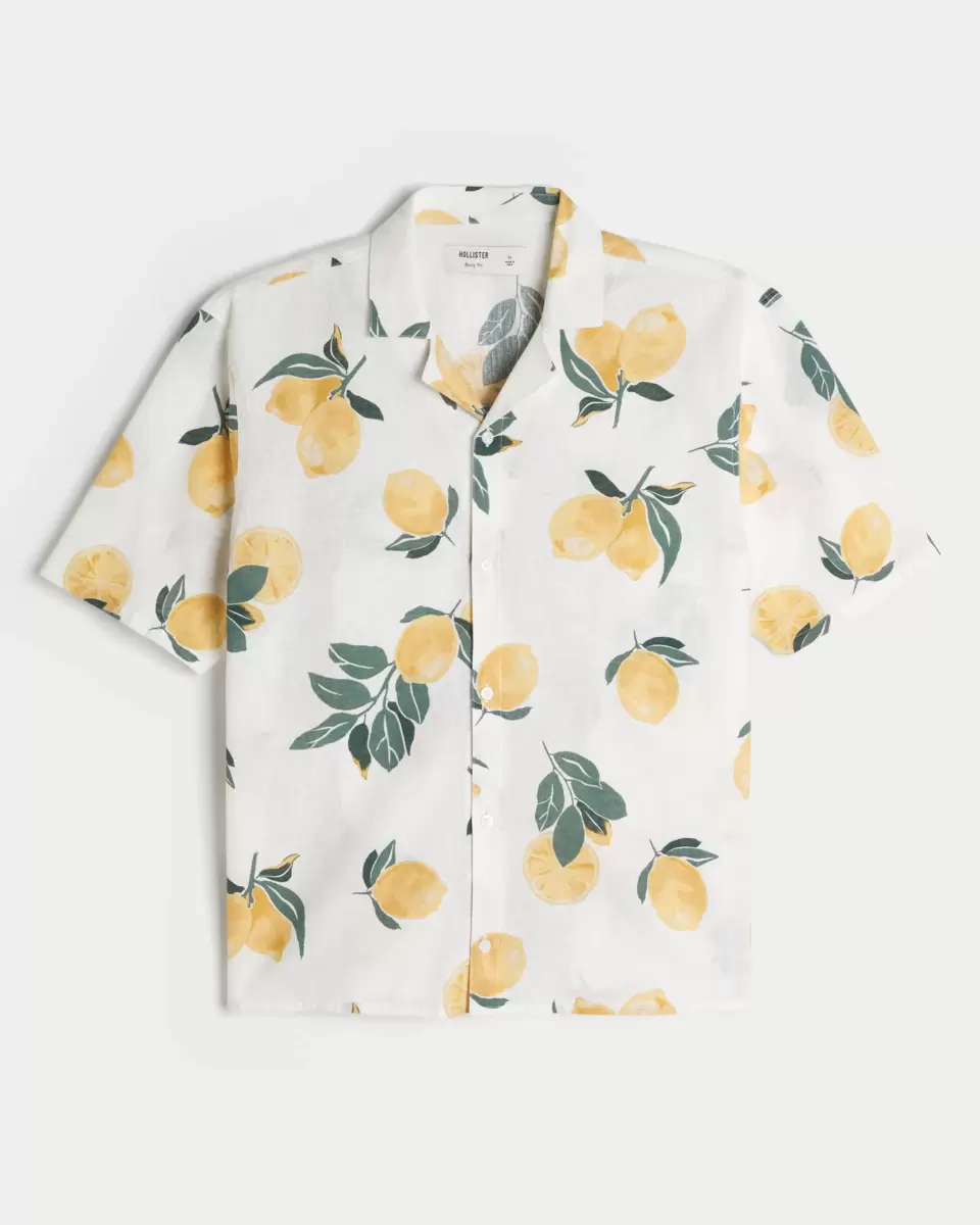 A classic short-sleeve shirt featuring an all-over lemon graphic pattern. Short sleeves, button closure, collar, linen-blend fabric. Boxy Fit. Imported.