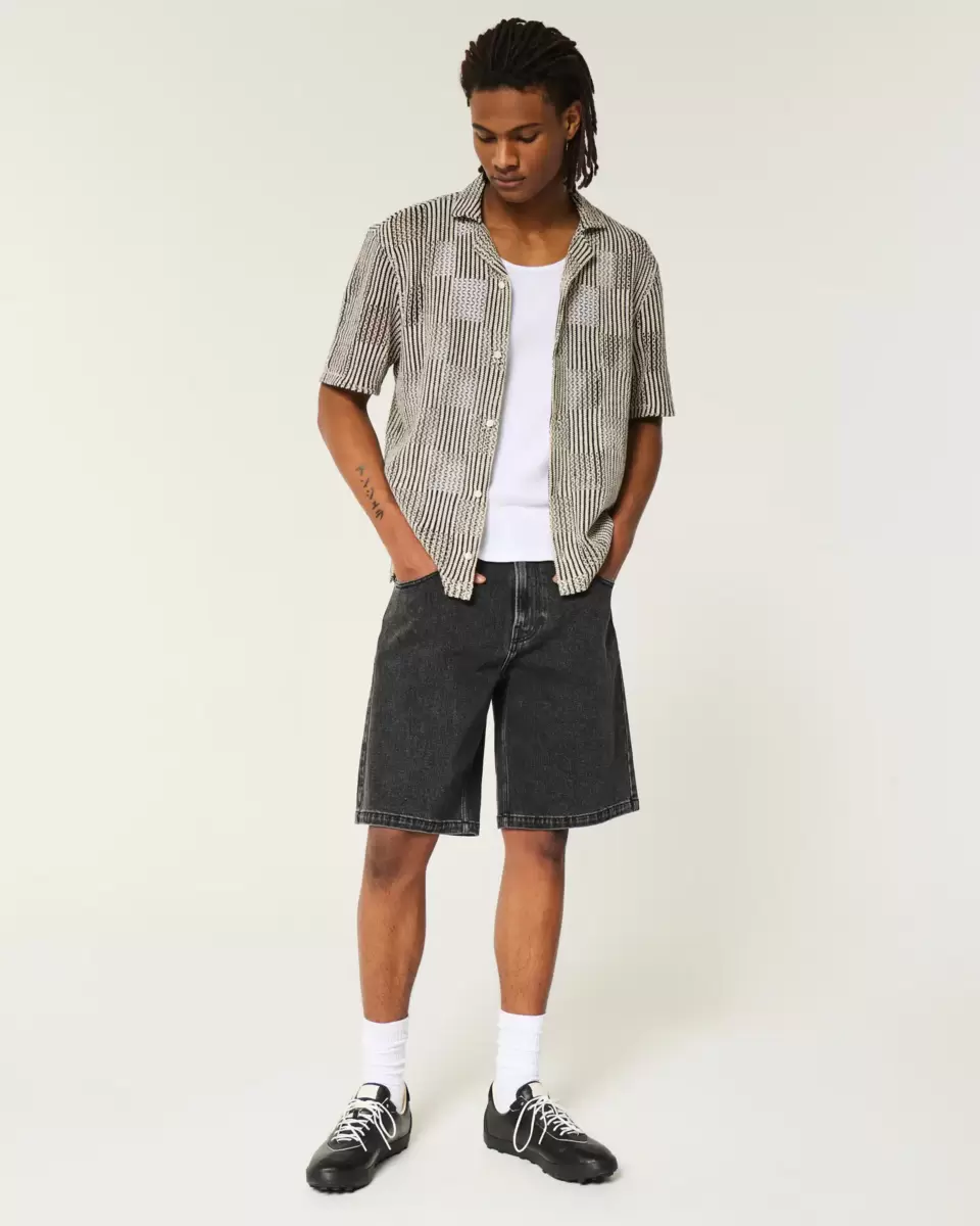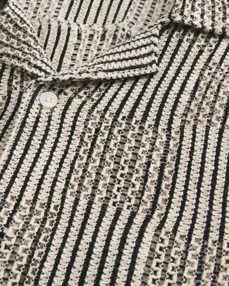 An ultra-comfortable short-sleeve shirt in crochet-style fabric with a checkerboard pattern and full button closure. Collar. Boxy Fit. Imported.