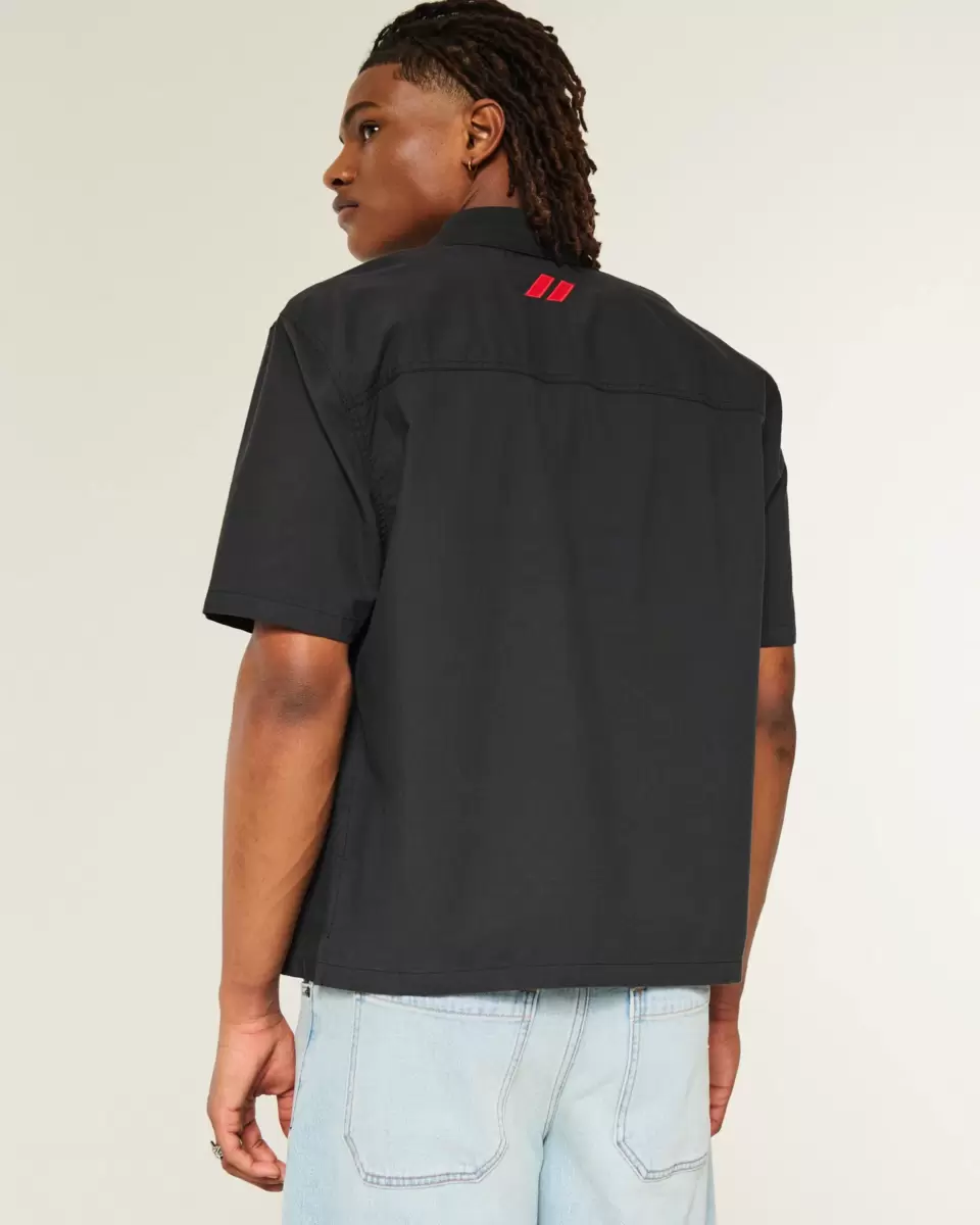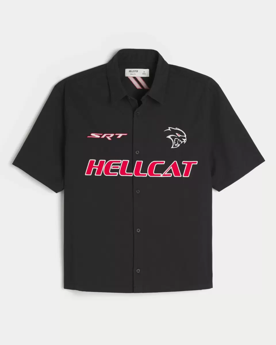 A classic workwear-style shirt with short sleeves and a full button closure. Official licensed Dodge Hellcat graphic embroidery at the front and back, collar, short sleeves. Boxy Fit. Imported.