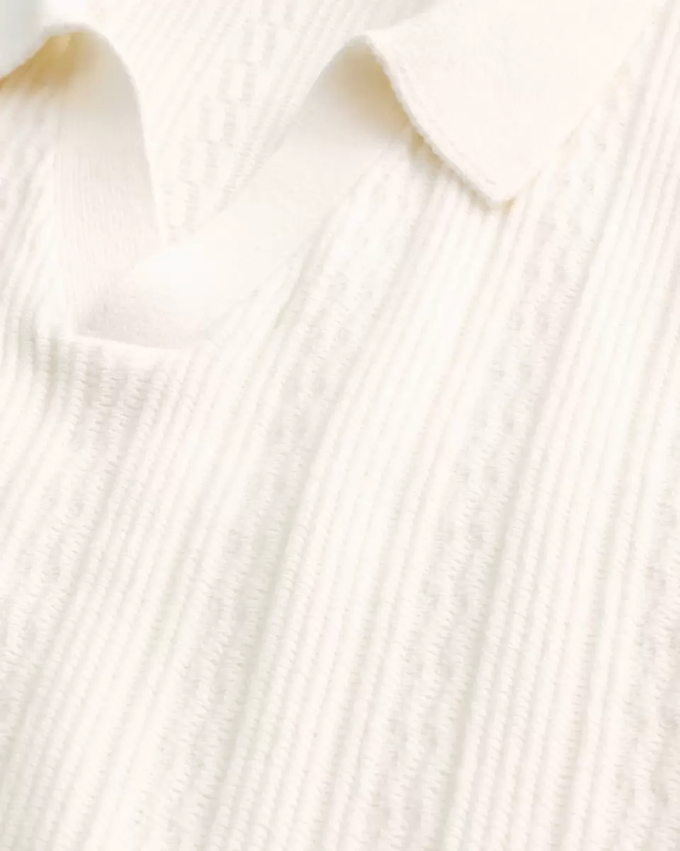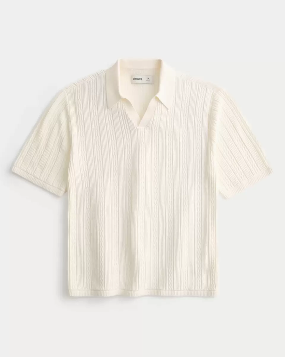 This sweater polo is made with super soft knit material featuring classic textured patterns. Collar, short sleeves, buttonless placket, ribbed hems. Boxy Fit. Imported.