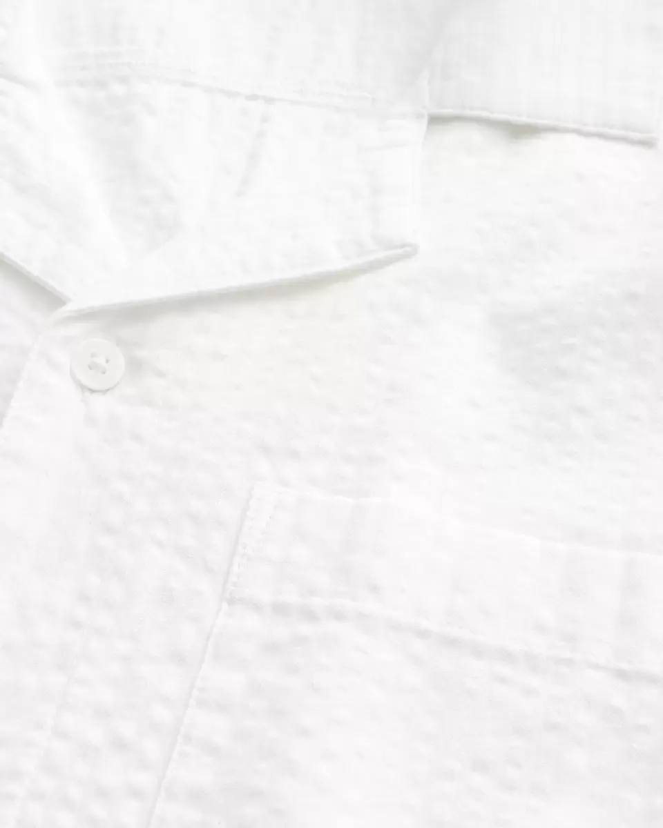 This classic button-through shirt is made with soft seersucker cotton fabric. Collar, short sleeves, left chest pocket. Imported.