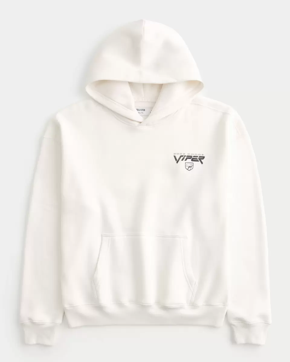 A super soft fleece hoodie featuring official licensed Dodge Viper print graphics at the left chest and back. Hood, front pouch pocket, long sleeves. Boxy Fit. Imported.