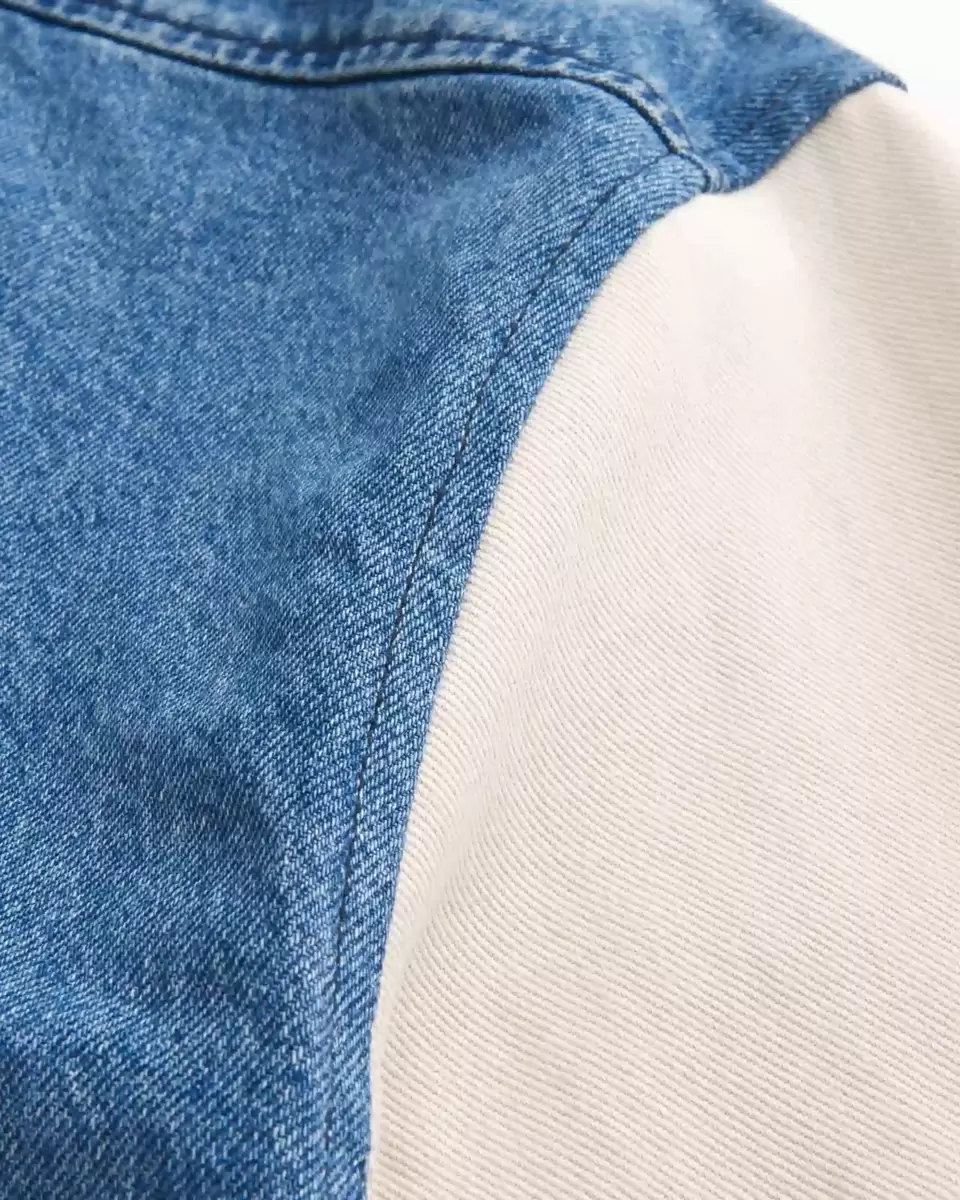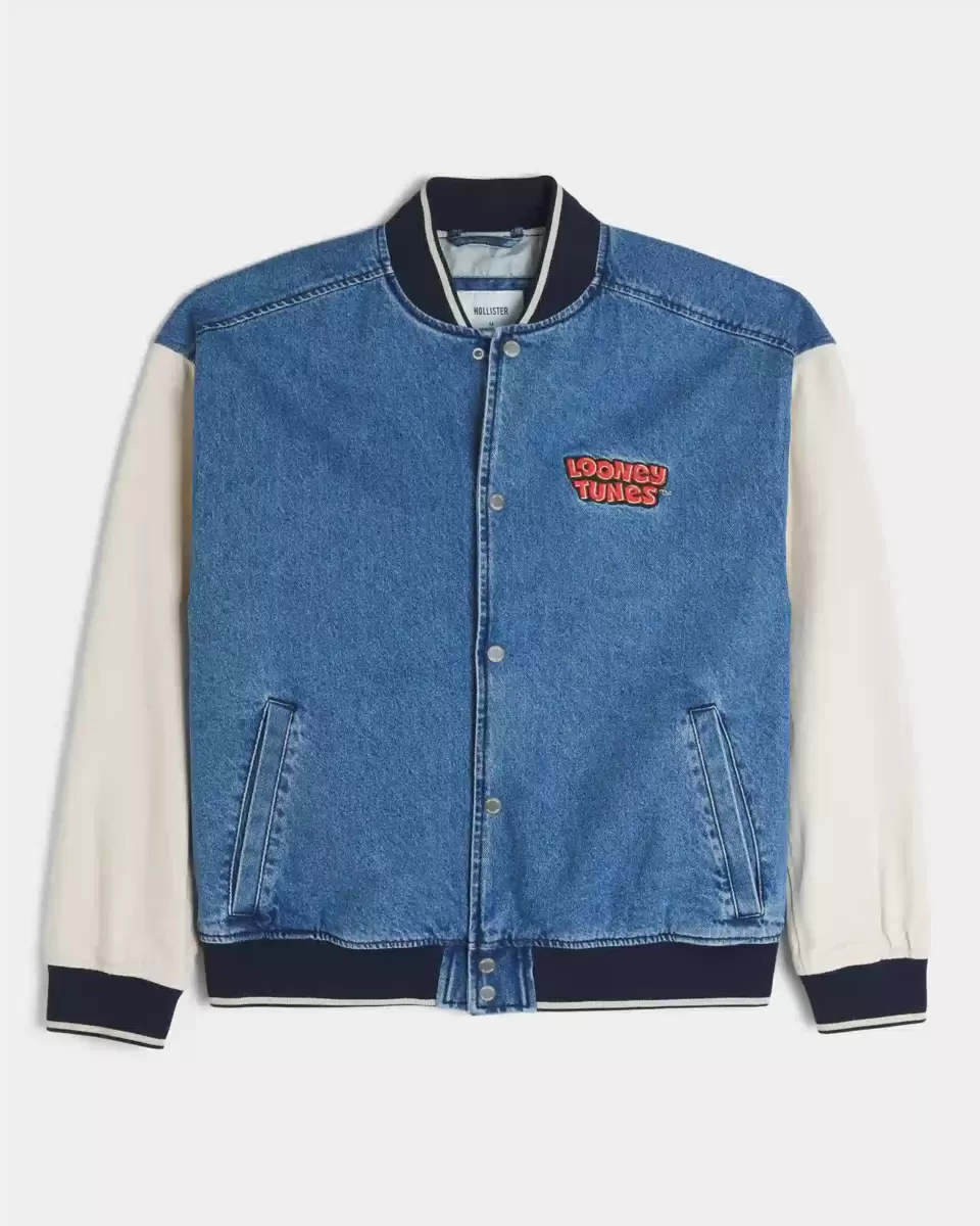 A classic jacket with a denim body and twill sleeves, featuring official licensed Looney Tunes graphic embroidery at the left chest and back. Banded hems, snap closure, pockets. Imported.