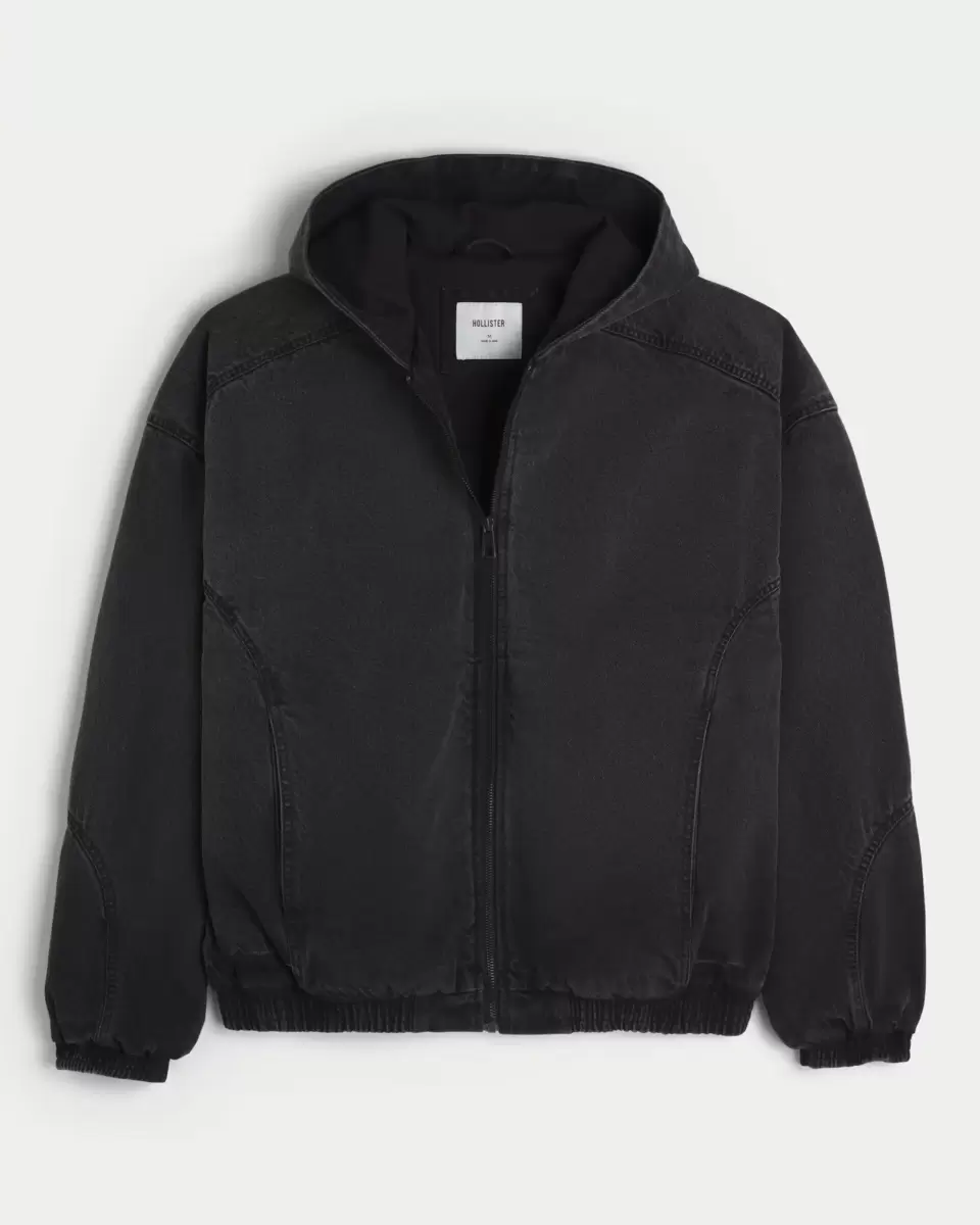 A denim jacket in washed black, with a full zip-up closure, front pockets and hood. Seam details, cinched hems. Imported.