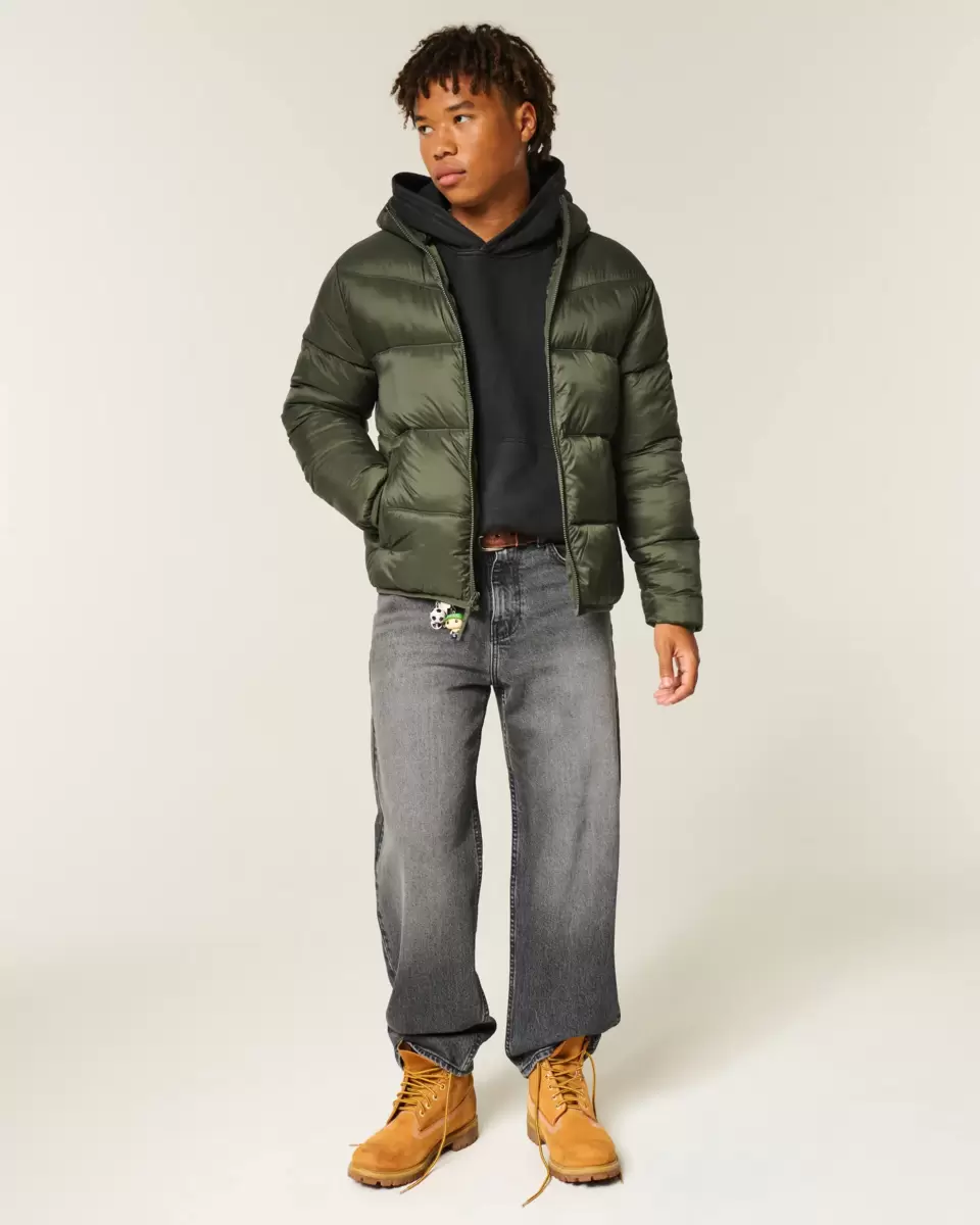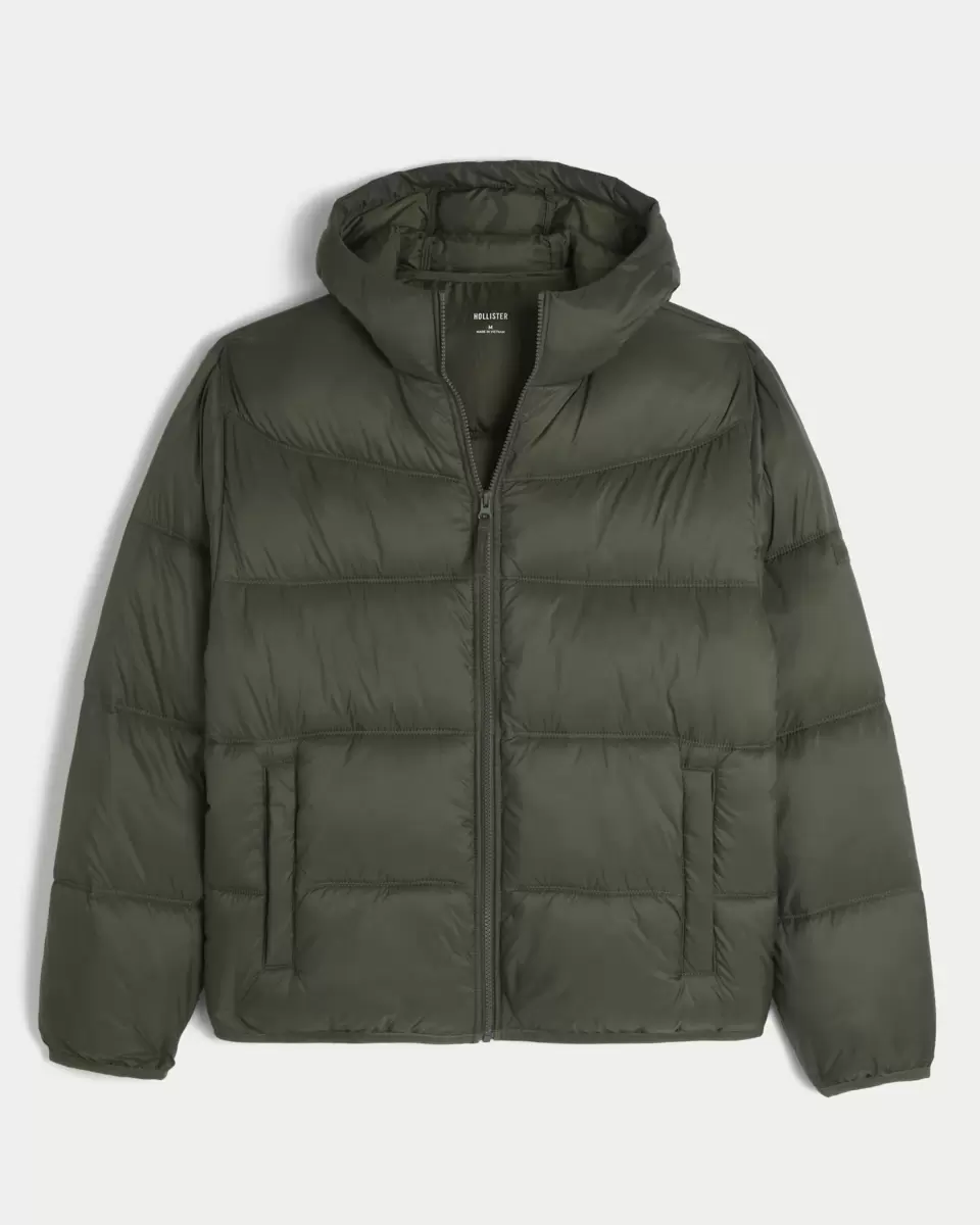 A comfortable, unlined puffer jacket designed with quilted channels. Full zip-up closure, front pockets, logo detail at left sleeve, hood. Imported.