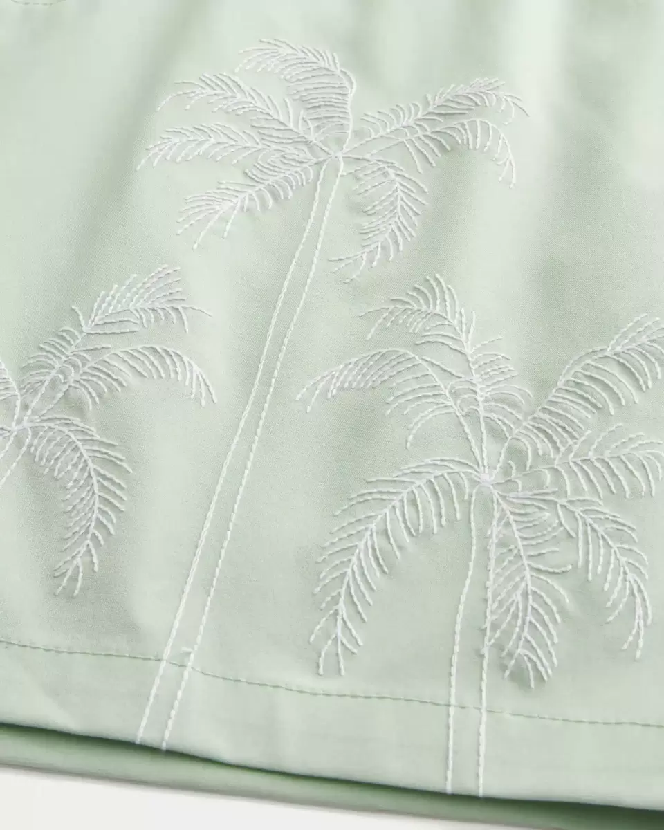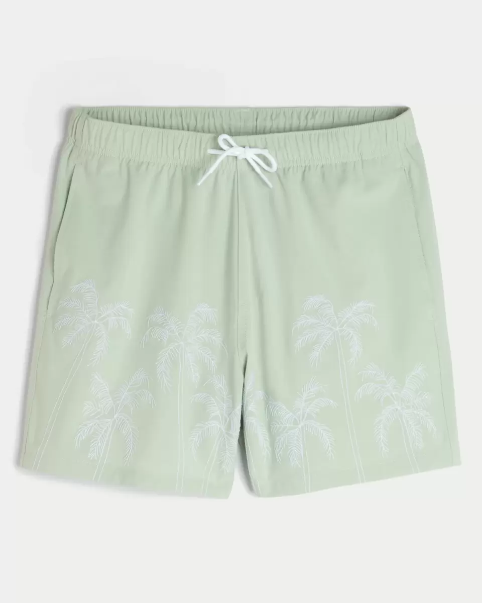 Shorter-length swim trunks that hit mid-thigh. Featuring comfortable 4-way stretch swim fabric and a 5.5″ inseam. Pockets, embroidered palm tree graphics. Imported.