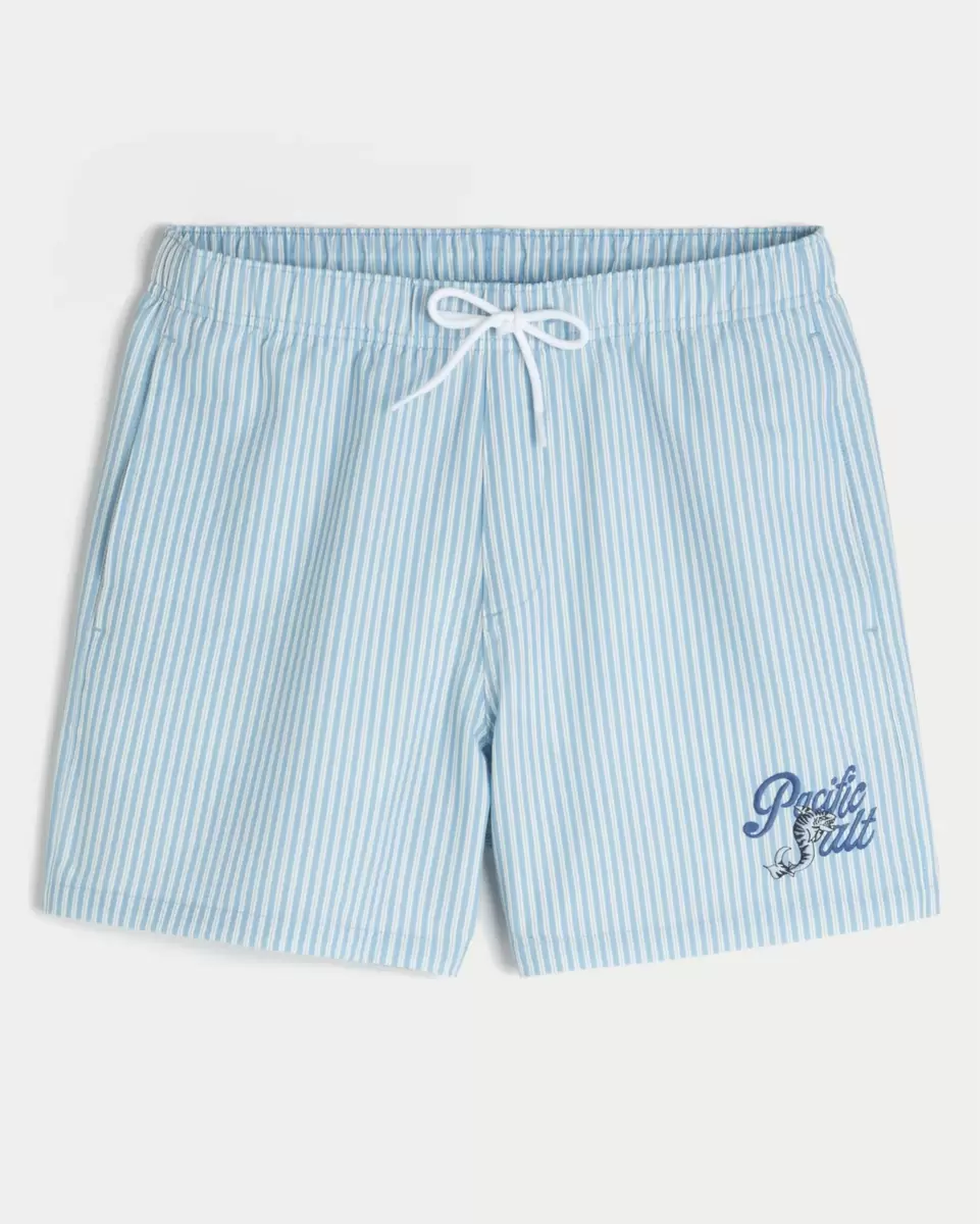 Shorter-length swim trunks that hit mid-thigh. Featuring comfortable 4-way stretch seersucker swim fabric and a 5.5″ inseam. Front pockets, mesh lining. Imported.