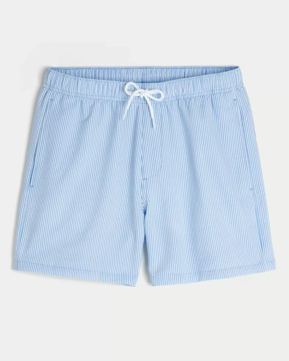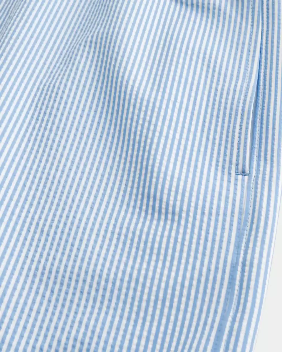 Shorter-length swim trunks that hit mid-thigh. Featuring comfortable 4-way stretch seersucker swim fabric and a 5.5″ inseam. Front pockets, mesh lining. Imported.