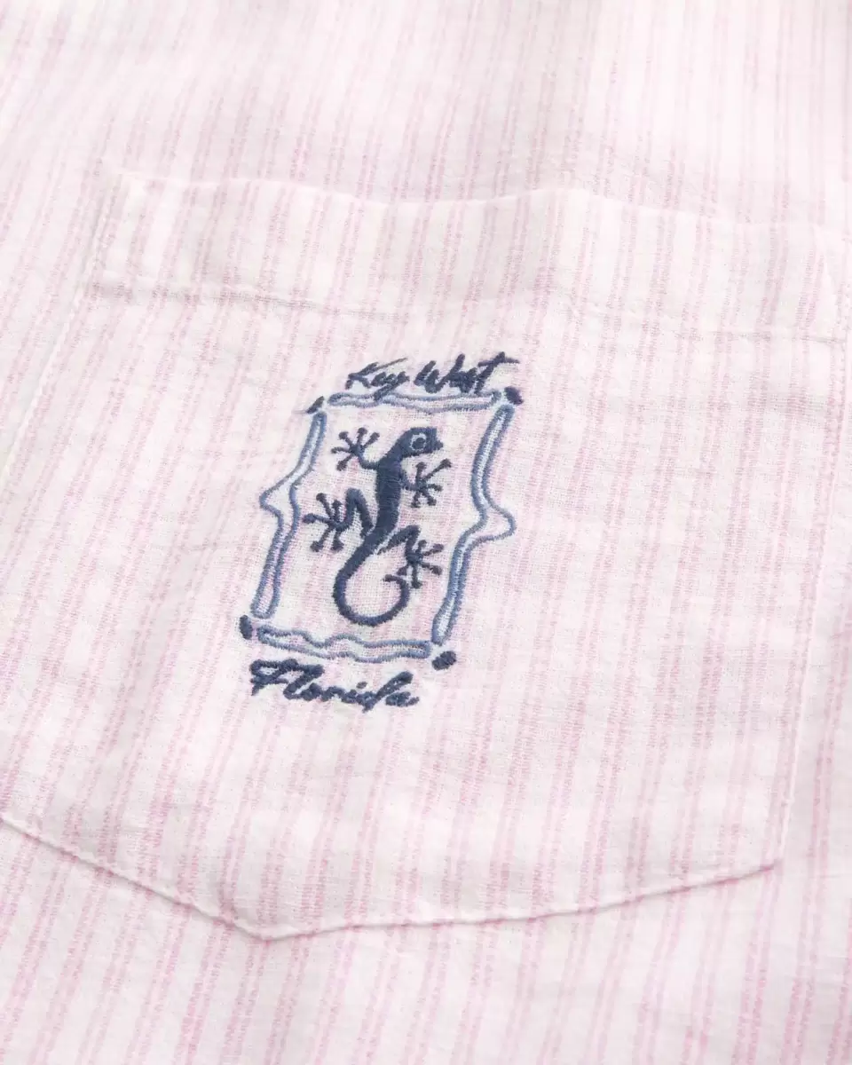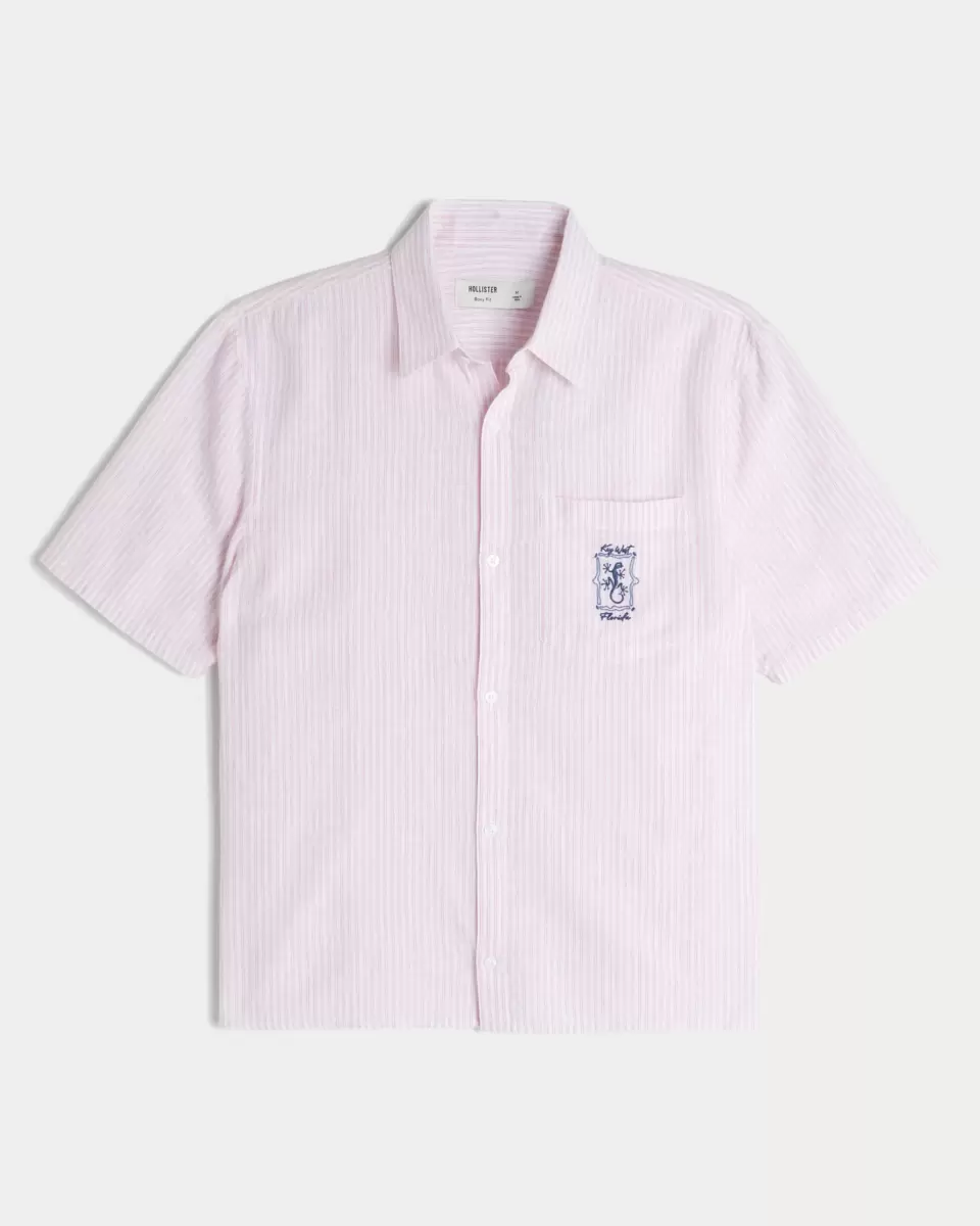 This classic shirt is made with a soft linen blend and features Key West Florida graphic embroidery at the left chest pocket. Camp collar, short sleeves, full button closure. Boxy Fit. Imported.