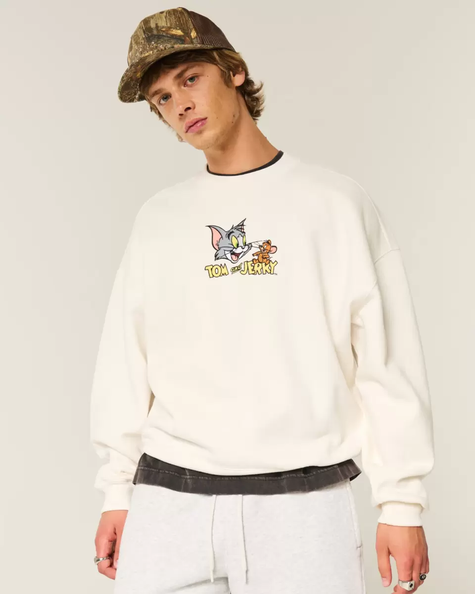 This super soft fleece sweatshirt features official licensed Tom and Jerry graphic embroidery. Crew neckline, long sleeves. Baggy Cinch Fit.