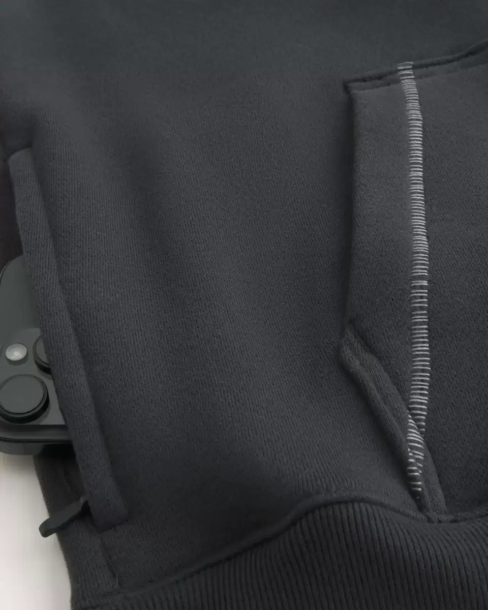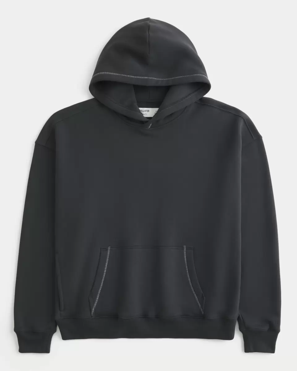 This super soft fleece hoodie features contrast stitching and a front pouch pocket. Hood, long sleeves. Boxy Fit. Imported.