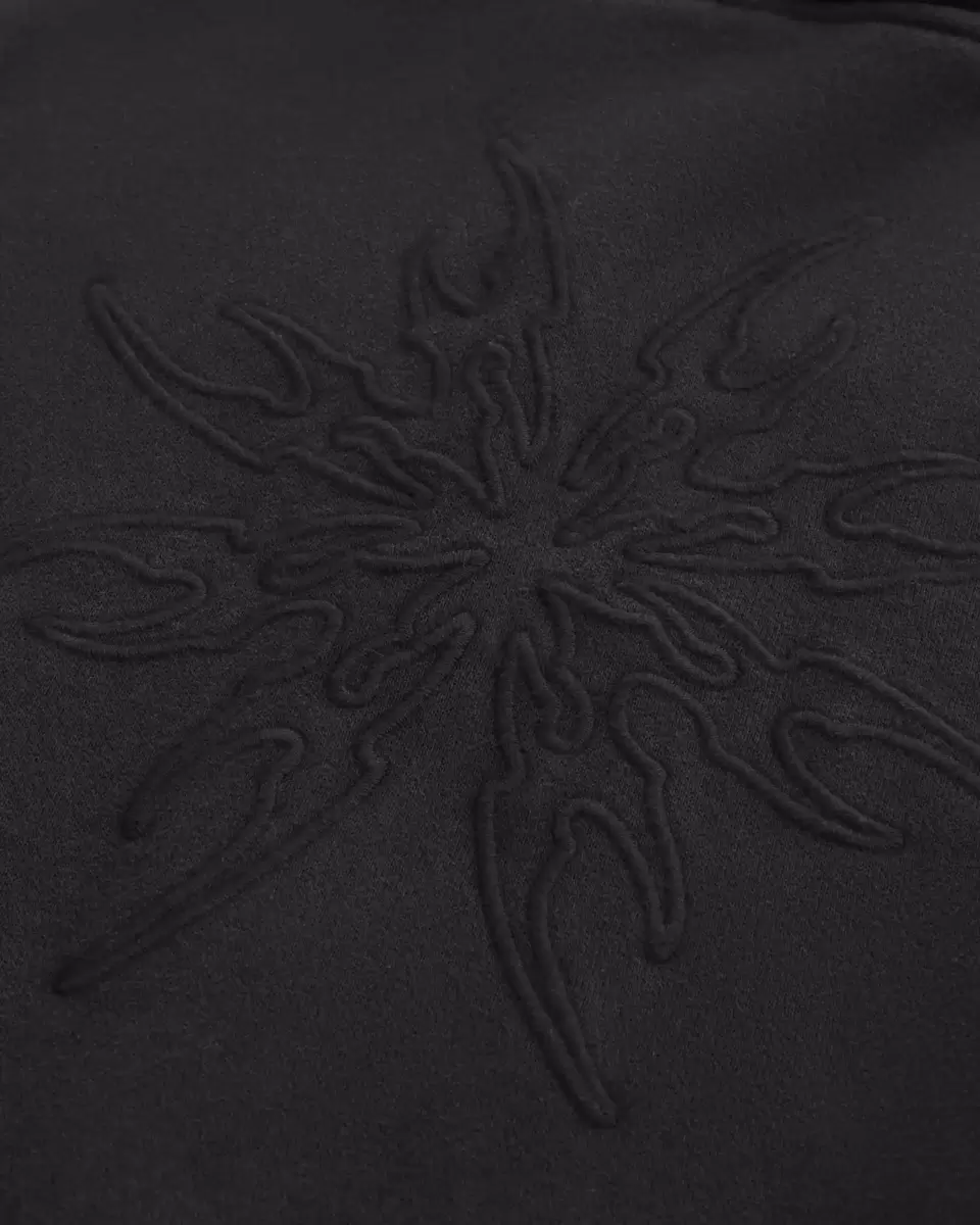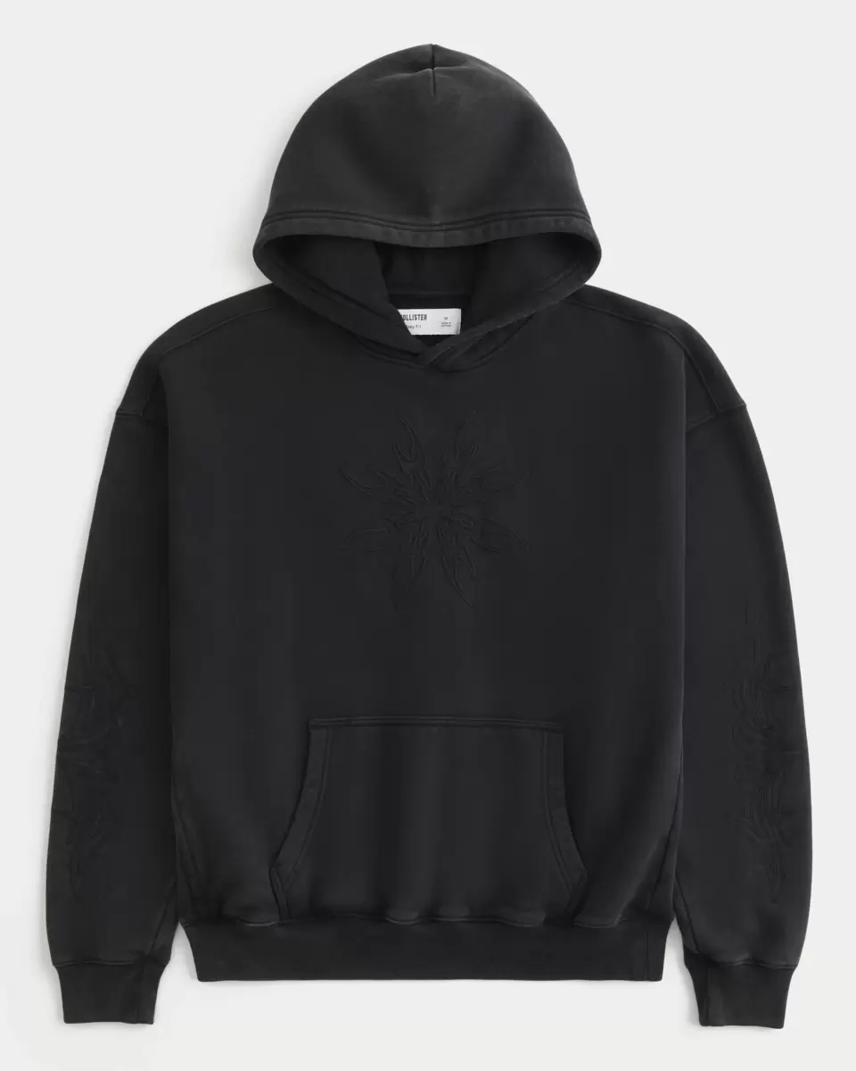 A super soft fleece hoodie featuring graphic embroidery. Hood, front pouch pocket, long sleeves. Boxy Fit.