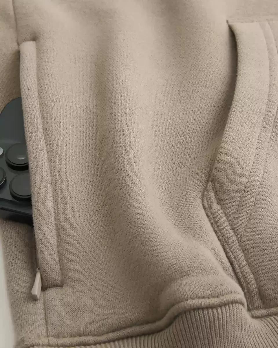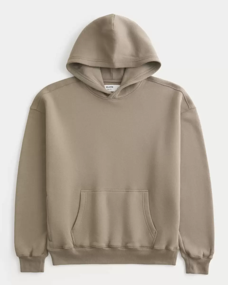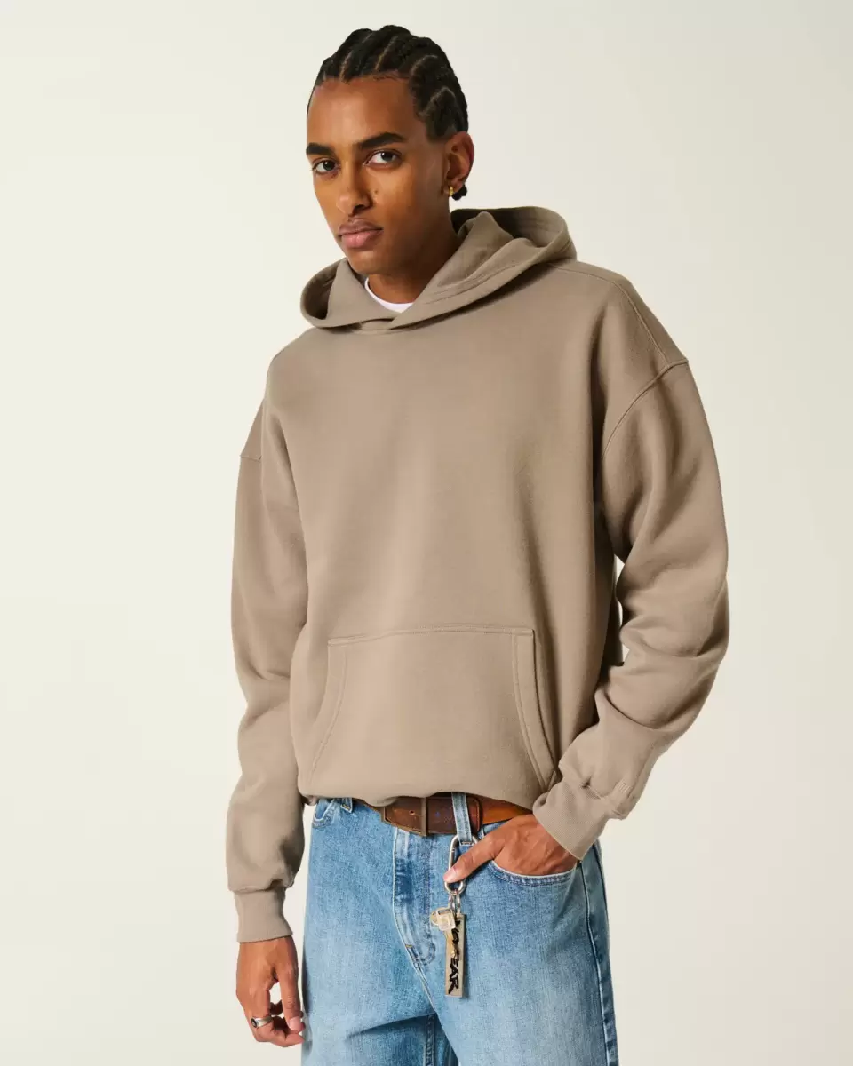 A super soft and comfortable fleece hoodie with a front pouch pocket and long sleeves. Embroidered logo detail at left sleeve, hood. Boxy Fit.