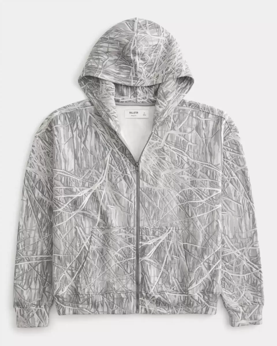 A super soft fleece hoodie featuring an all-over camo pattern. Full zip-up closure, front pockets, hood, long sleeves. Boxy Fit. Imported.
