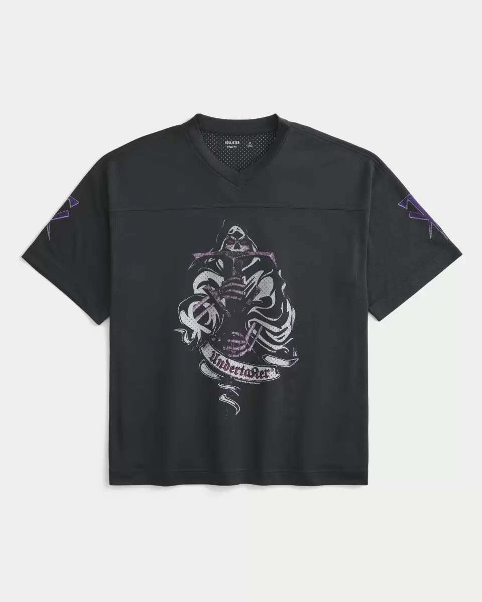 Made with soft mesh fabric, this football jersey features official licensed Undertaker WWE print graphics at the front, back and sleeves. V-neckline, short sleeves. Baggy Fit.