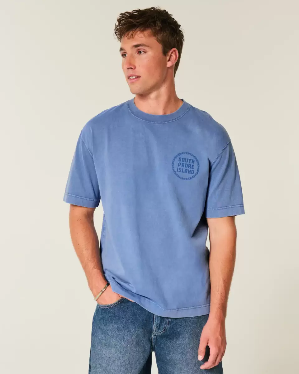 A super soft, heavyweight 100% cotton tee featuring South Padre Island Texas print graphics at the left chest and back. Crew neckline, short sleeves. Boxy Fit.