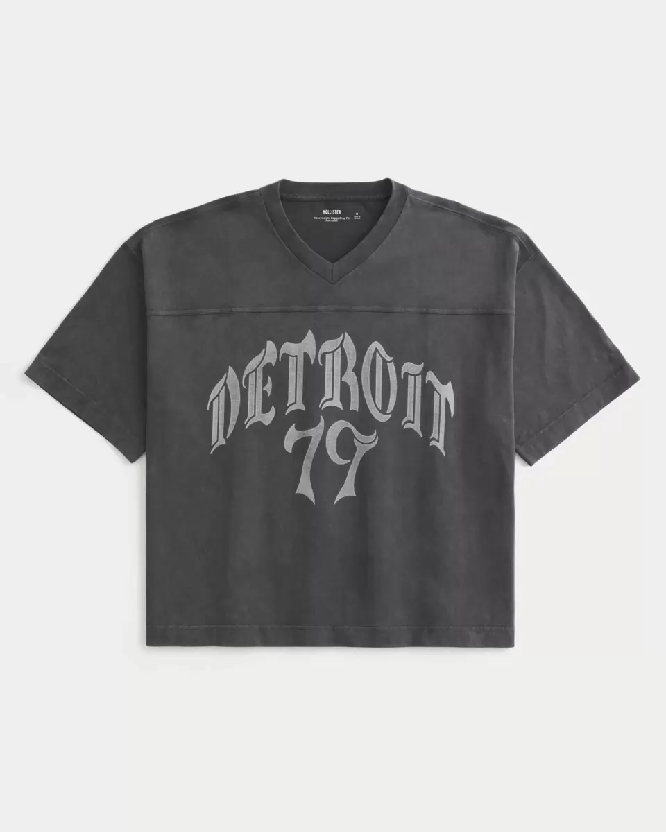 This super soft football t-shirt is made with super soft, heavyweight 100% cotton. Featuring Detroit print graphics, v-neckline, short sleeves. Baggy Crop Fit.