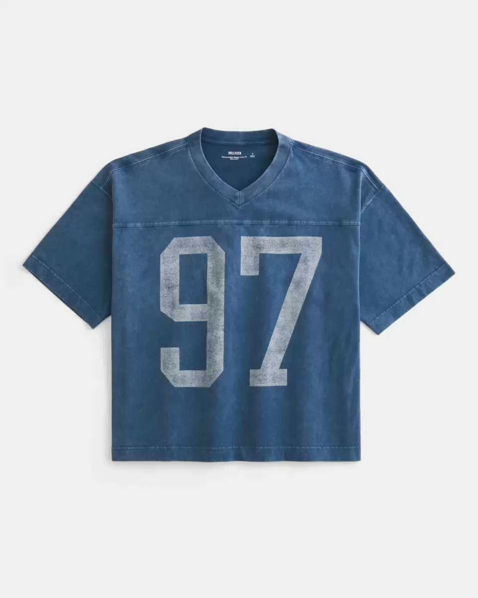 This super soft tee is made with heavyweight 100% cotton and features a varsity-style number print graphic. V-neckline, short sleeves. Baggy Crop Fit.
