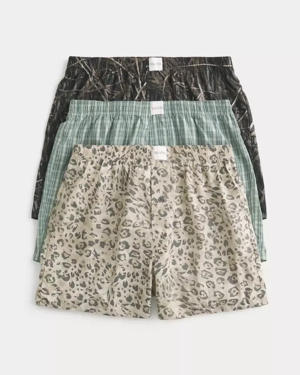 Includes 3 pairs of cotton boxer shorts: leopard print, plaid and camo. Soft waistband, logo tab. Imported.