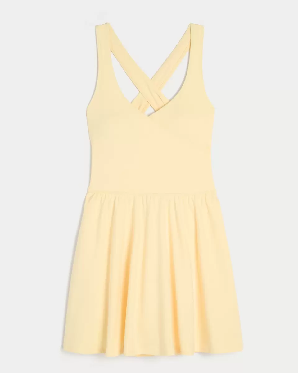 An ultra-comfortable active dress designed in our breathable, 4-way stretch, moisture-wicking Recharge fabric with a super soft, brushed feel. Built-in shorts and sports bra, wrap-style front and halter straps that cross in back. Imported.