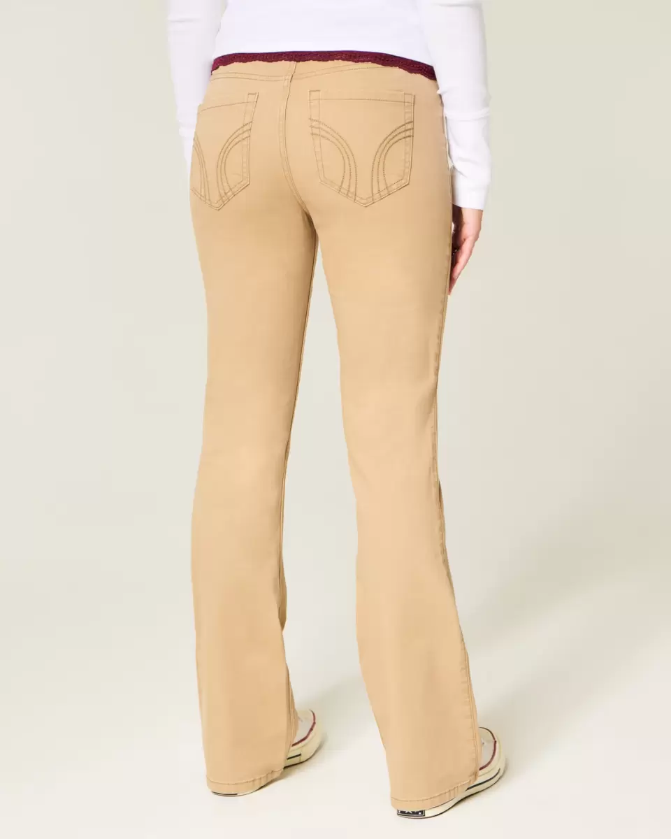 Comfortable denim jeans designed with a mid-rise waist and boot hem. Khaki color. Imported.
