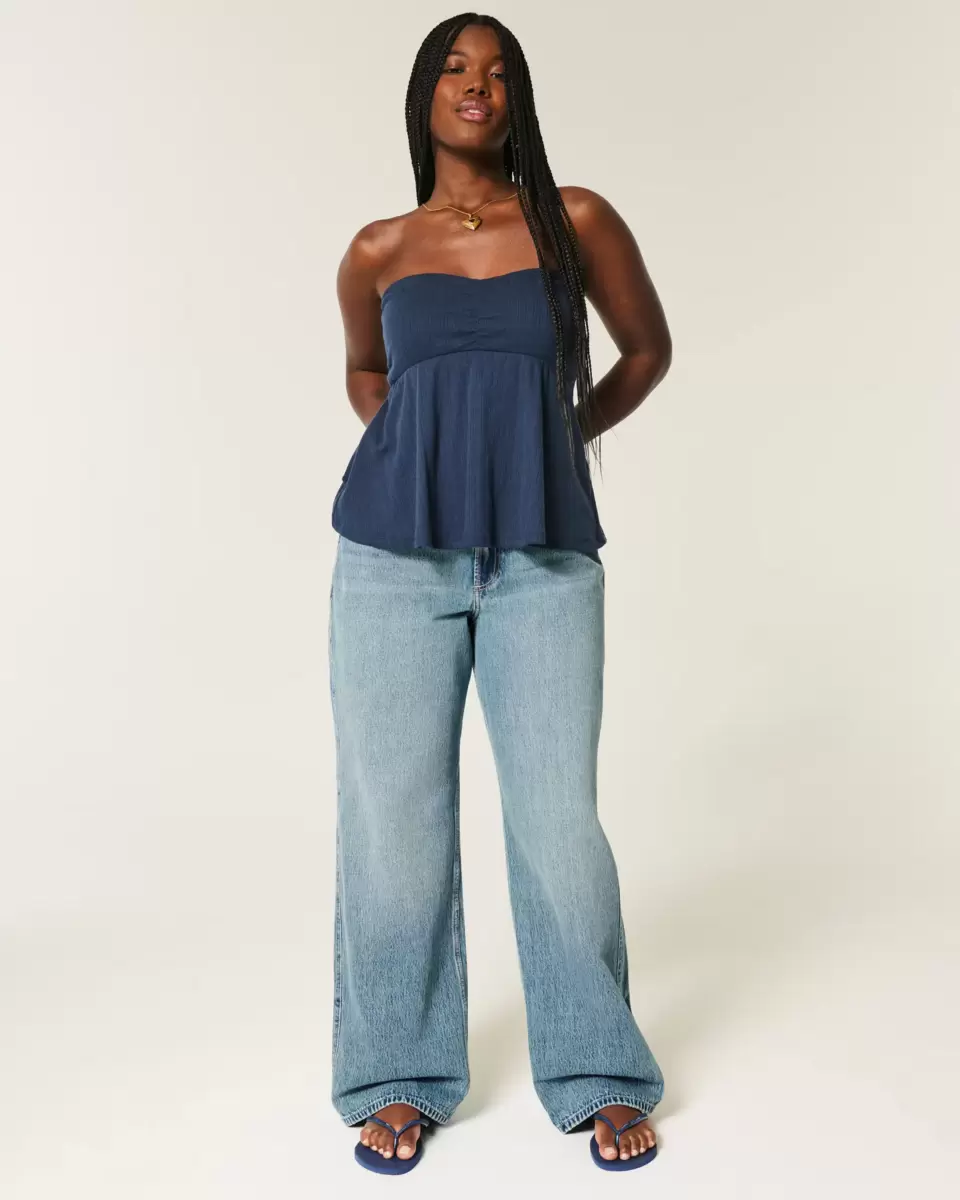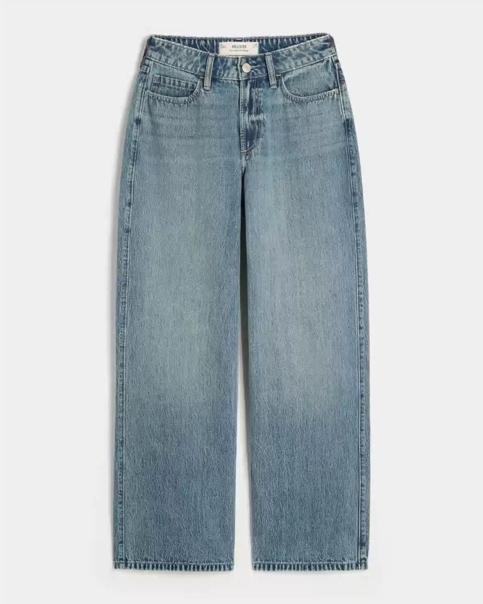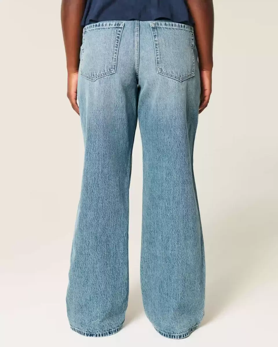 These comfy jeans are designed with a high-rise waist and baggy leg. Fading, whiskering. Imported.